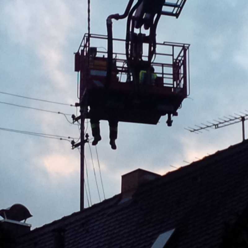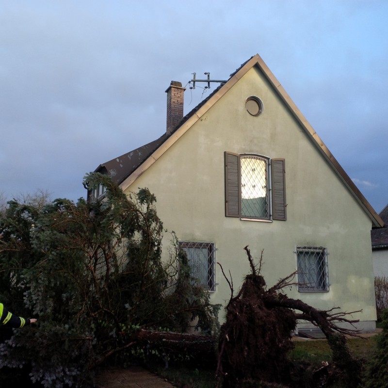 Beim Umstürzen hatte dieser den Dachstromanschluss eines Hauses beschädigt, dass dieser vom Dach gerissen wurde. In Folge waren drei Häuser ohne Strom. Die Feuerwehr musste sich den Zugang mit der Kettensäge freischneiten, um anschließend die Stromleitung entfernen zu können. Der Energieversorger wurde hinzugerufen, konnte allerdings aufgrund vieler anderer Einsätze nicht vor Ort kommen.