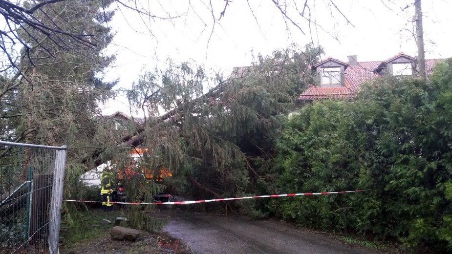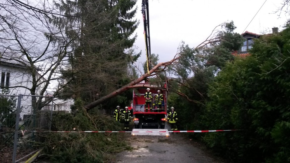 Die Feuerwehr Haar wurde in die Johann-Karg-Straße alarmiert. Dort drohte ein Baum in eine Telefonleitung zu fallen. Über den Kran am LKW wurde der Baum gesichert und anschließend mit der Kettensäge aus der Drehleiter abgetragen.