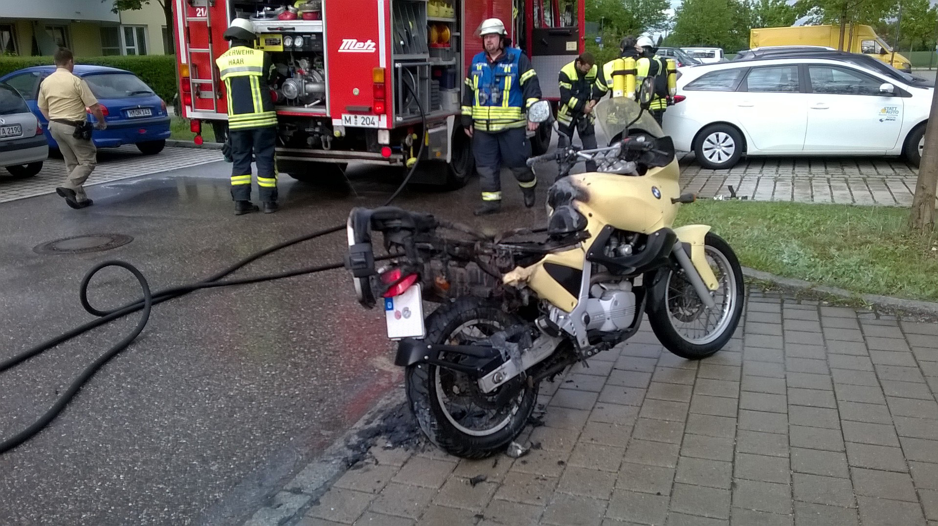 Die Feuerwehr Haar wurde zu einem brennenden Motorrad in die Tassilostraße alarmiert.