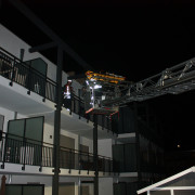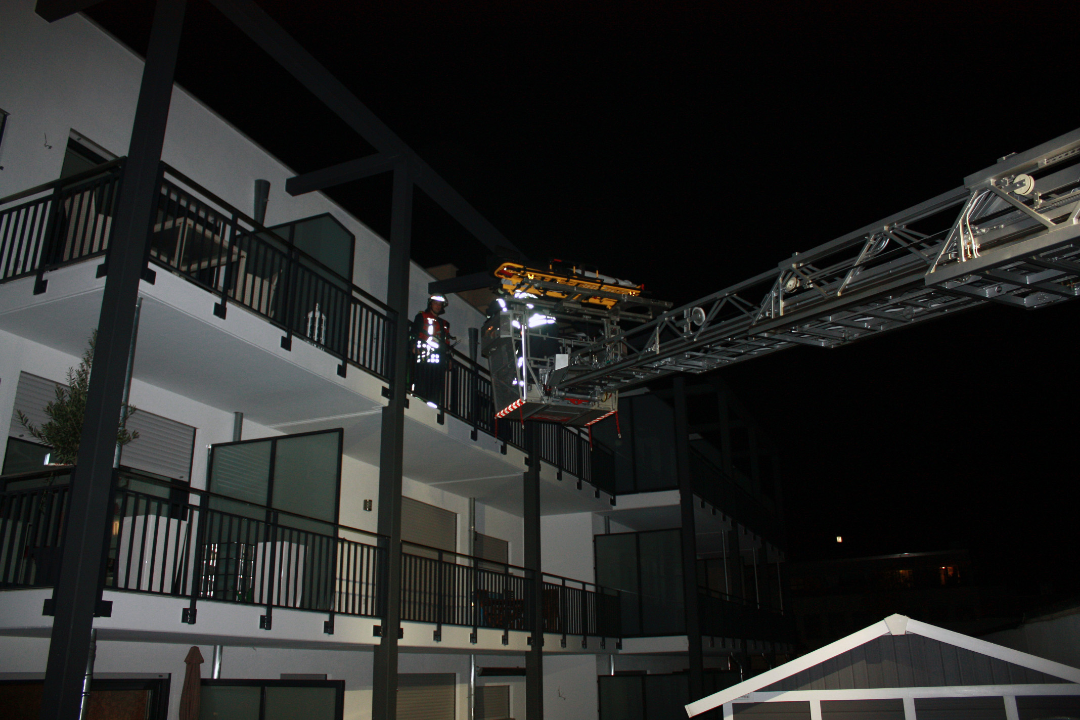 Dort forderte der Rettungsdienst die Drehleiter an, um eine Person unter Beatmung aus dem 2. Obergeschoss zu Boden zu bringen. Mit der Krankentragenhalterung am Korb konnte der Patient liegend zu Boden gebracht und an den Rettungsdienst zur weiteren Behandlung übergeben werden.