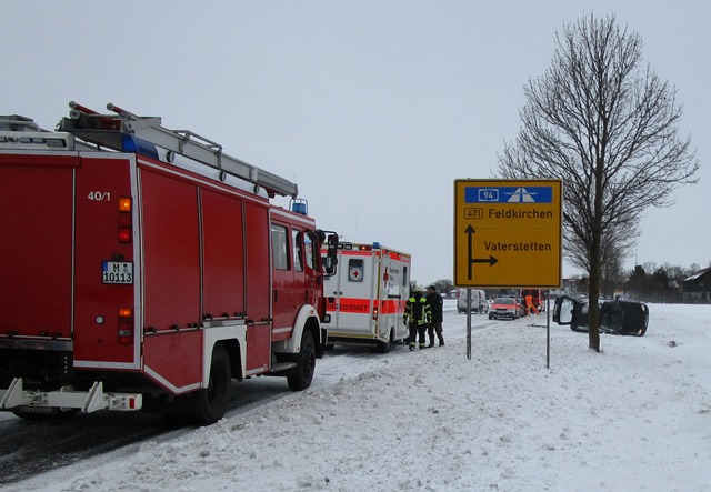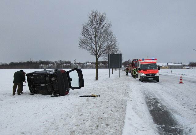 Ein PKW war vermutlich aufgrund von Straßenglätte von der Fahrbahn abgekommen und im angrenzenden Feld auf der Seite zu liegen gekommen. Bei Eintreffen der Feuerwehr Haar versorgte bereits der ebenfalls alarmierte First Responder aus Feldkirchen die Fahrerin. Die Feuerwehr Haar übernahm die Absicherung der Einsatzstelle und kontrollierte das Unfallfahrzeug auf auslaufende Betriebsstoffe.