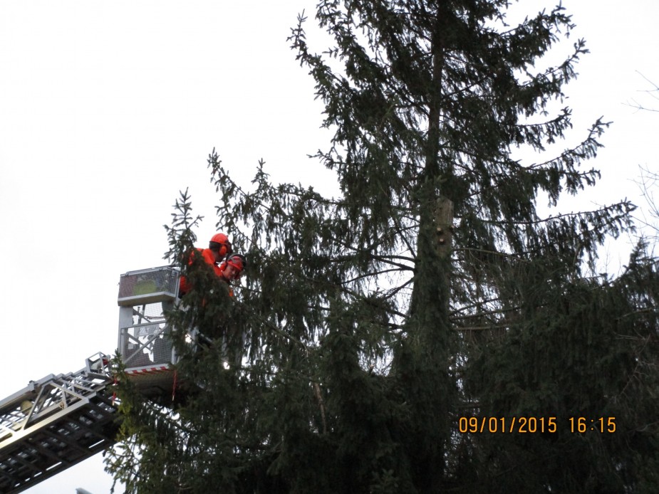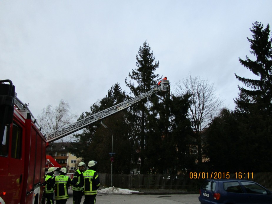 Aus dem Korb der Drehleiter trug die Feuerwehr Haar den Baum bis auf eine Höhe von ca. 5 Metern ab und beseitigte so die Gefahr.