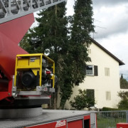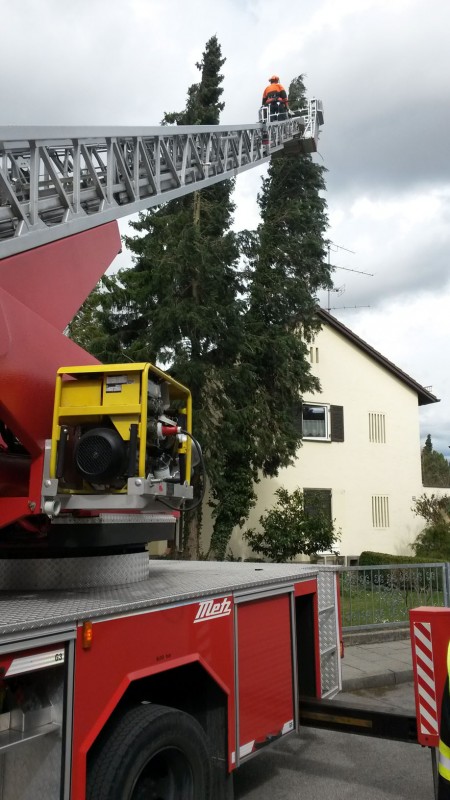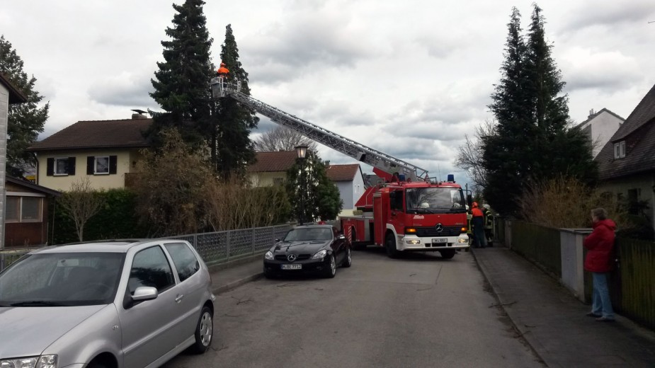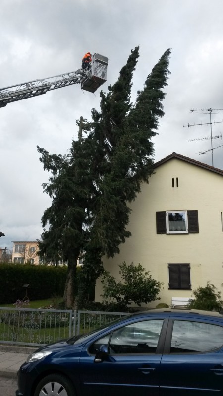 Über die Drehleiter konnte die Feuerwehr die Bäume so weit abtragen, dass die Windlast genommen werden konnte. Wegen des erneut auffrischenden Windes mussten die Arbeiten jedoch abgebrochen werden und zu einem späteren Zeitpunkt fortgesetzt werden.