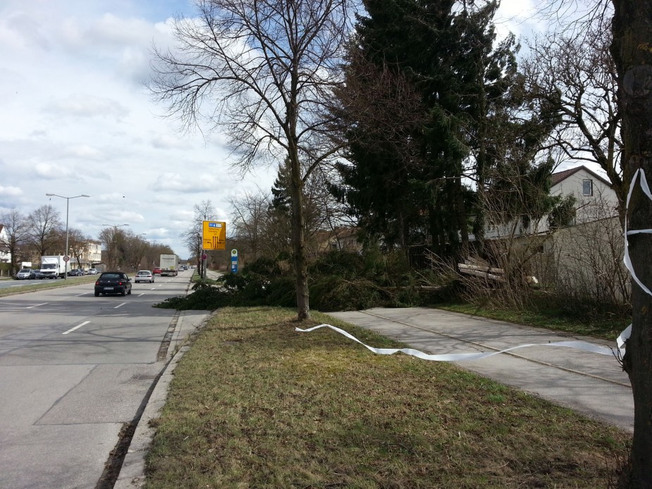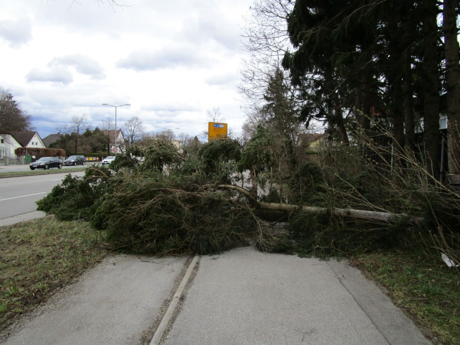 Auf Höhe der Leibstraße war ein Baum Richtung B304 gestürzt und versperrte den Rad- und Fußweg. Mit einer Kettensäge konnte die Feuerwehr den Baum zerkleinern und somit den Weg wieder frei machen.