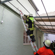 Über Telefon wurde der Feuerwehr gemeldet, dass in der Leibstraße ein Plastikdach durch den Sturm beschädigt wurde und nun lose auf dem Dachgerüst lag.
