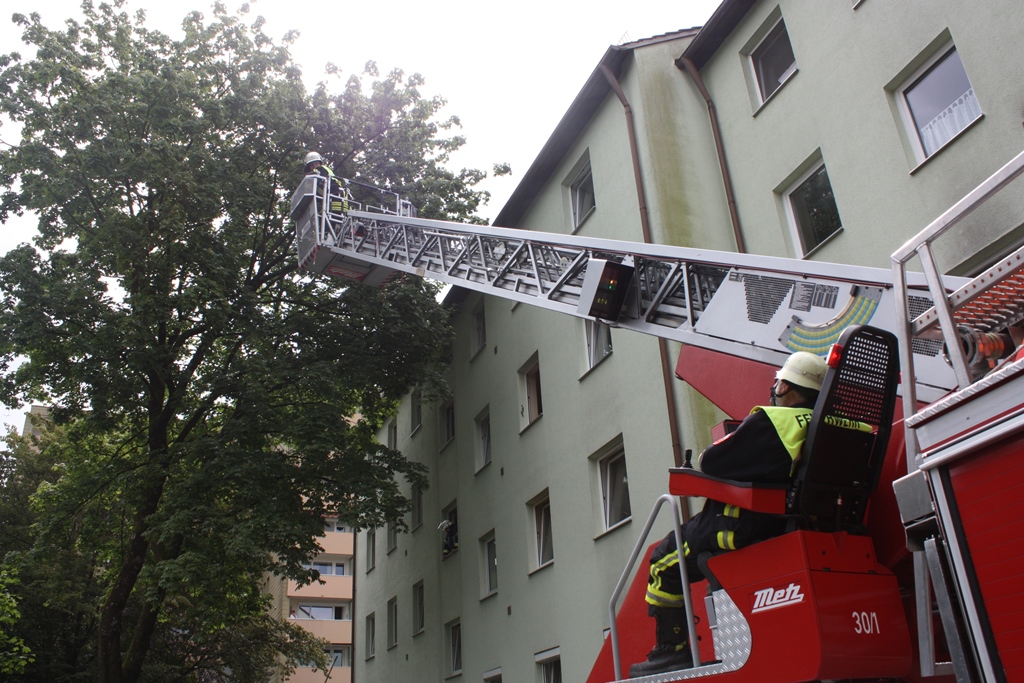 Die Nachbarin einer in ihrer Wohnung gestürzten Bewohnerin wollt ihr aufhelfen, dabei ist ihr die eigene Wohnungstür zugefallen. Da kein Notdienst verfügbar war, musste die Feuerwehr anrücken. Über ein geöffnetes Fenster konnten sich die Einsatzkräfte Zutritt zur Wohnung verschaffen und die Tür öffnen.