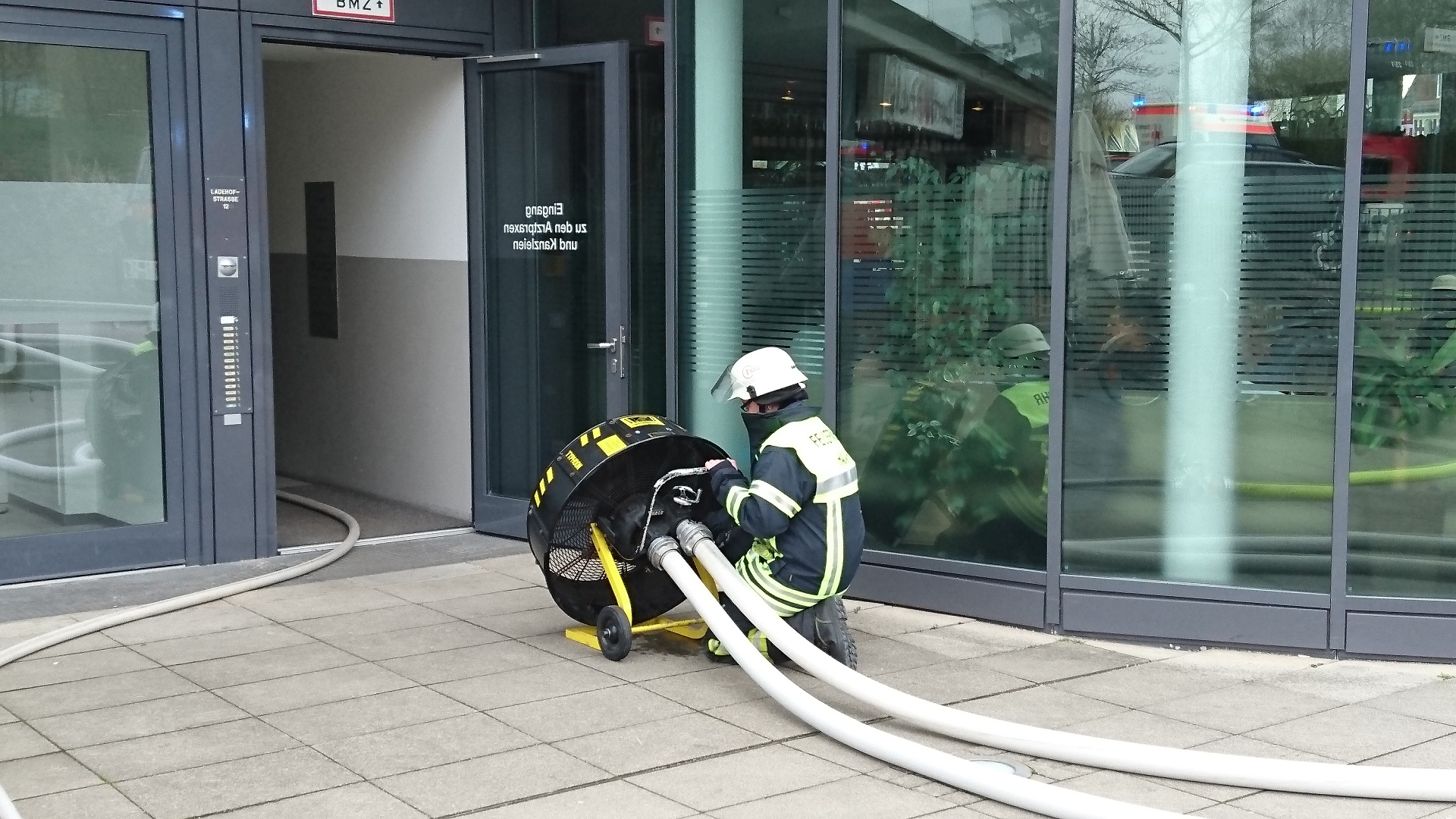 Beim Eintreffen der Einsatzkräfte war bereits Brandgeruch in einem Wohn- und Gewerbebau in der Ladehofstraße wahrnehmbar. In einer Praxis wurde die Feuerwehr fündig. Bereits von außen war durch die Fenster eine starke Verrauchung sichtbar. Mit einer Kettensäge musste sich die Feuerwehr gewaltsam Zutritt zur Arztpraxis verschaffen. Dort hatte sich direkt im Eingangsbereich ein Brand entwickelt. Mehrere Trupps unter schwerem Atemschutz starteten sofort die Brandbekämpfung und Überdruckbelüftung. Um das Treppenhaus rauchfrei zu halten, kam auch ein mobiler Rauchabschluss zum Einsatz.