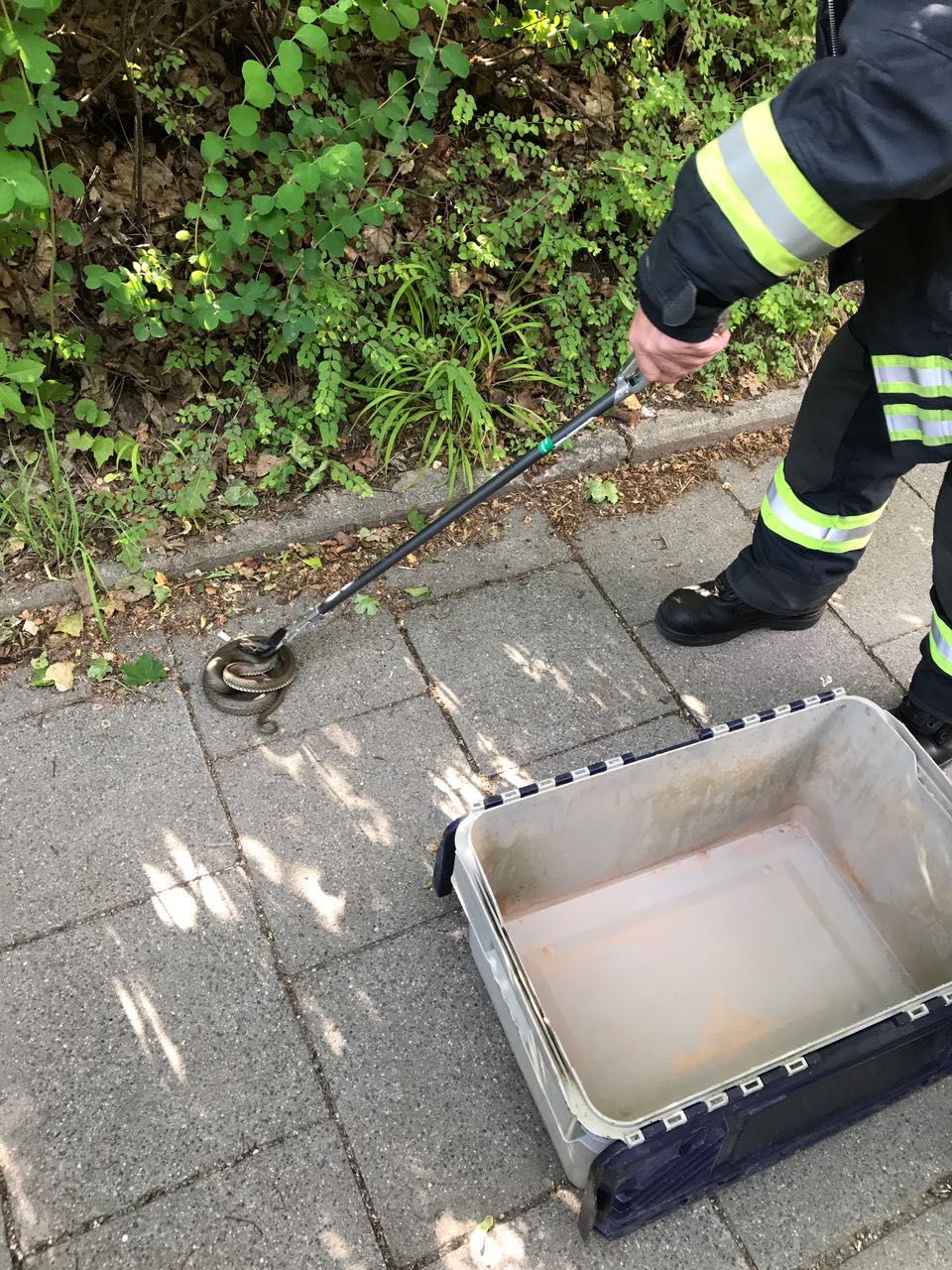 Die Feuerwehr Haar wurde in die Leibstraße gerufen, weil Fußgänger eine verletzte Schlange auf dem Gehweg liegend gefunden hatten.