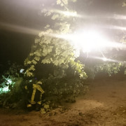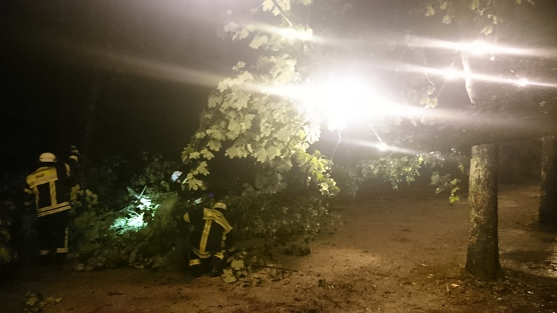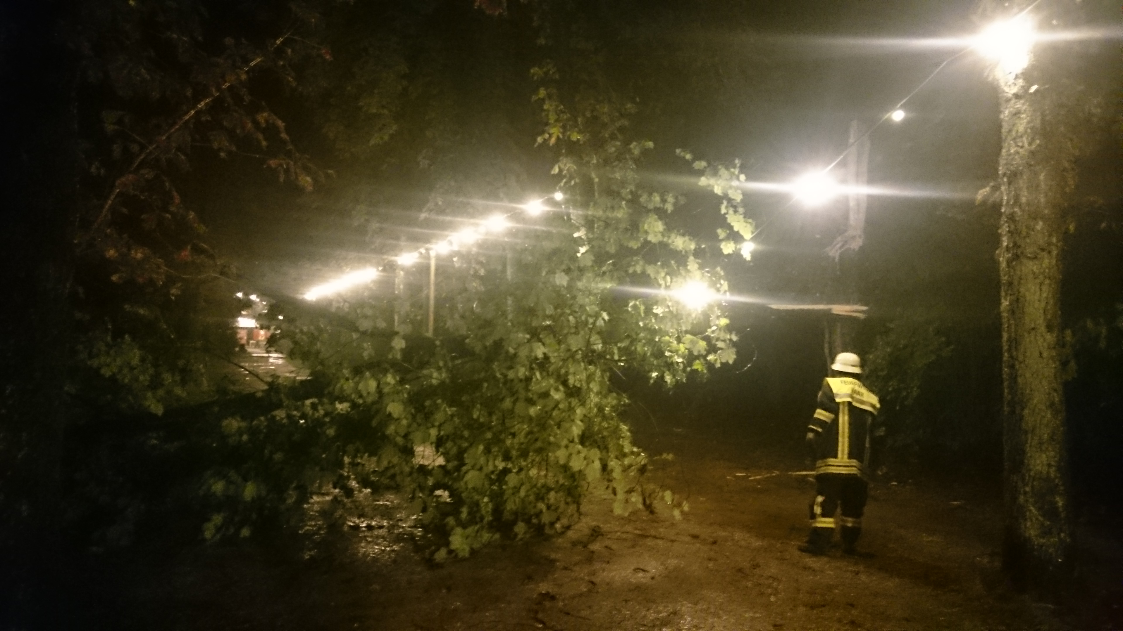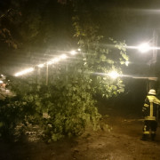 Dort stürzte ein Baum um und blockiert den Zugang zu einer Gaststätte. Der Baum hatte sich ebenfalls in einer Lichterkette verfangen. Die Feuerwehr trug den Baum vollständig ab und legte diesen auf einem Grünstreifen ab.