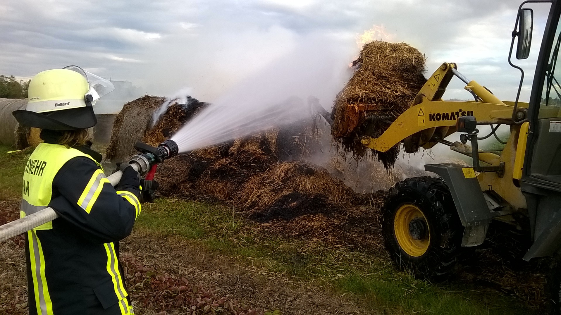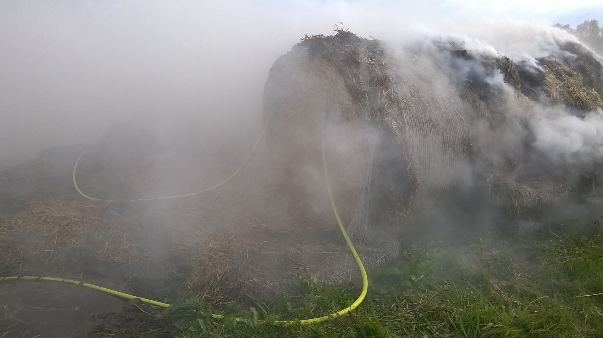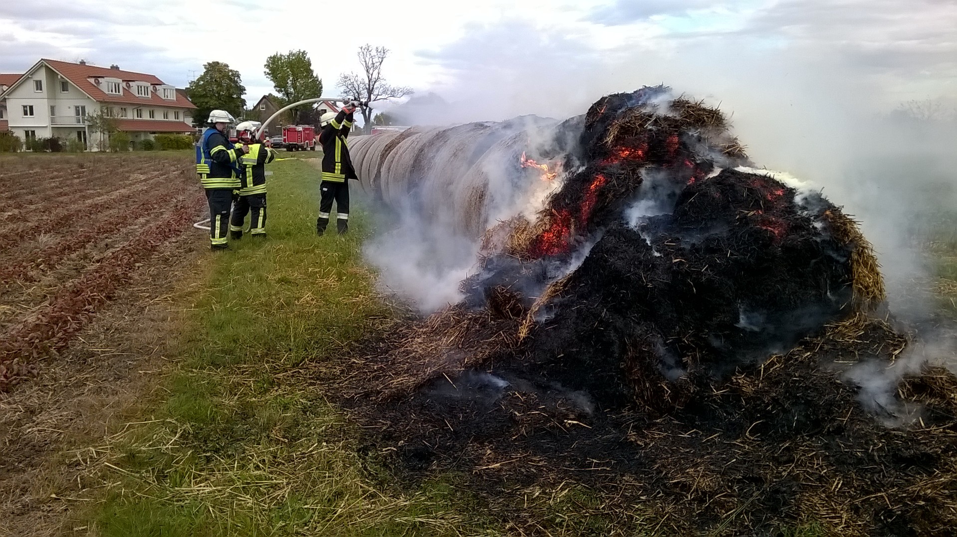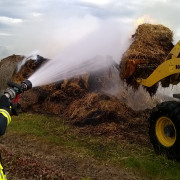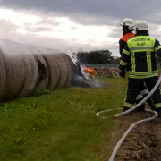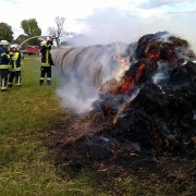 Mehrere Strohballen waren auf einem Feld in Brand geraten. Mit 2 C-Strahlrohren und sog. Fognails bekämpften die Einsatzkräfte unter schwerem Atemschutz den Brand. Zusätzlich wurde telefonisch ein Radlader organisiert, der beim Ausbreiten des Strohs half, damit alle Glutnester abgelöscht werden konnten. Mit der Wärmebildkamera wurde das komplette Stroh kontrolliert, um eine Wiederentzündung zu verhindern. Während der langwierigen Löscharbeiten wurden etwa 27.000 Liter Wasser verbraucht, das über das TLF 4000 und eine längere Schlauchleitung herangeschafft werden musste.