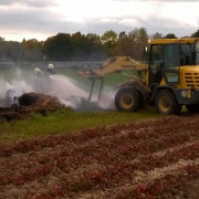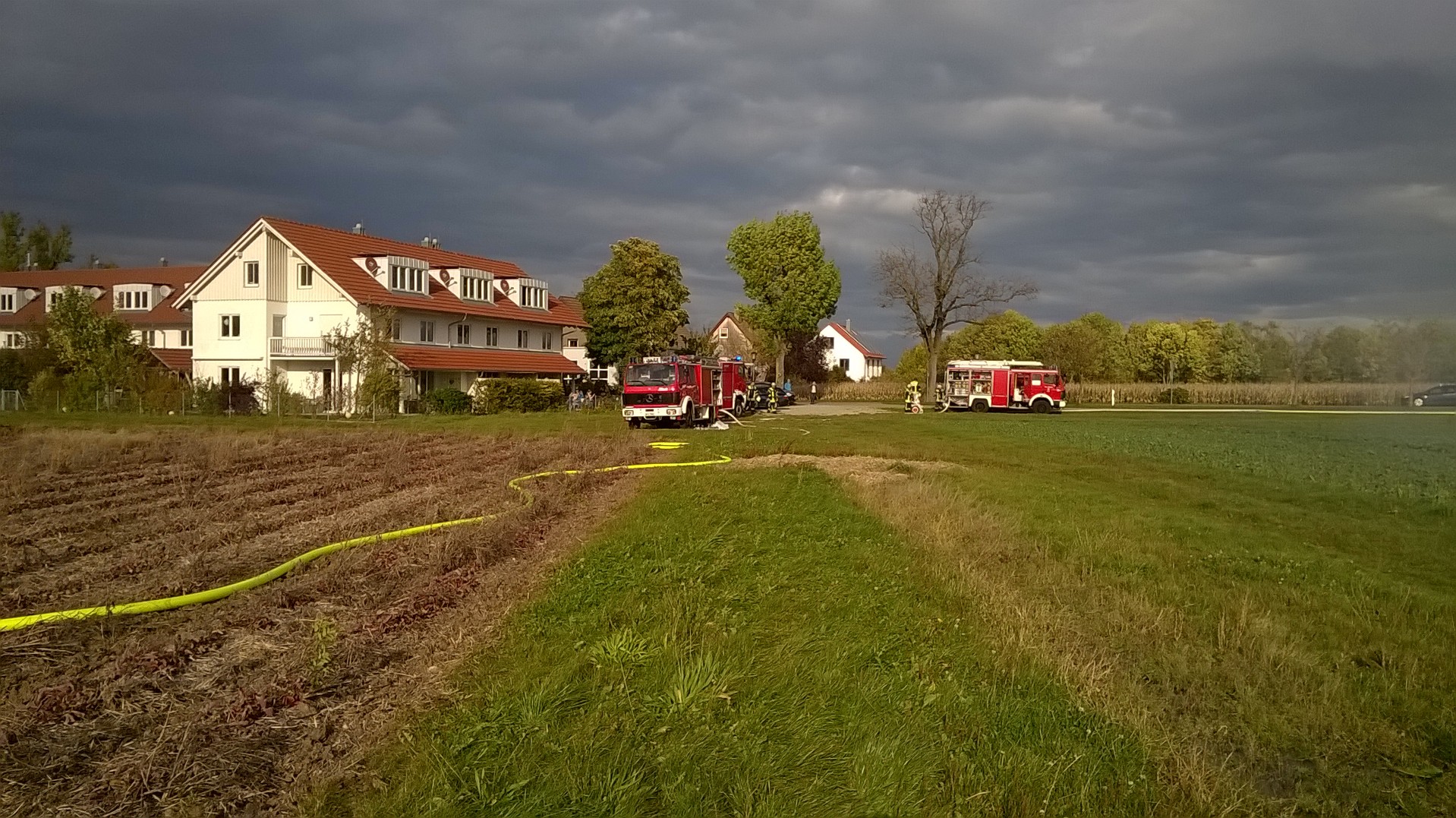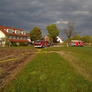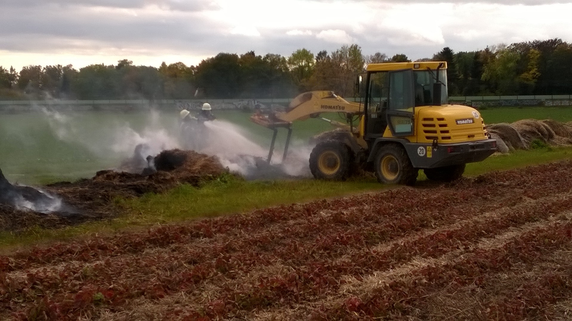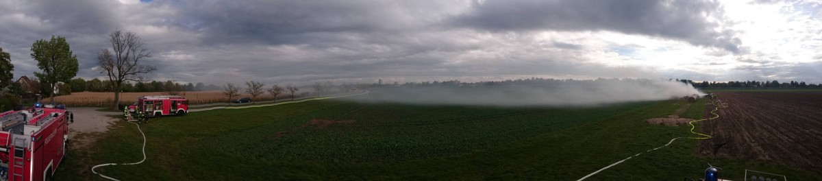 Mehrere Strohballen waren auf einem Feld in Brand geraten. Mit 2 C-Strahlrohren und sog. Fognails bekämpften die Einsatzkräfte unter schwerem Atemschutz den Brand. Zusätzlich wurde telefonisch ein Radlader organisiert, der beim Ausbreiten des Strohs half, damit alle Glutnester abgelöscht werden konnten. Mit der Wärmebildkamera wurde das komplette Stroh kontrolliert, um eine Wiederentzündung zu verhindern. Während der langwierigen Löscharbeiten wurden etwa 27.000 Liter Wasser verbraucht, das über das TLF 4000 und eine längere Schlauchleitung herangeschafft werden musste.