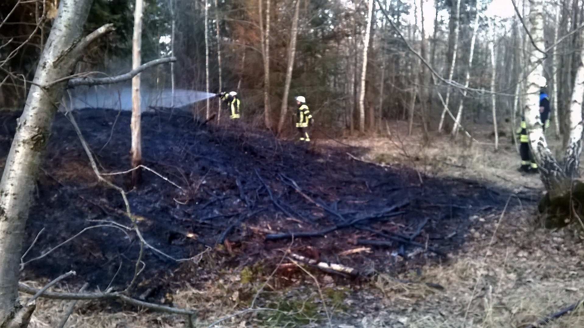 Die Einsatzkräfte aus Haar fanden im Wald an der von-Braunmühl-Straße in der Nähe des alten Wasserturms eine Fläche von etwa 50m² vor, die in Brand geraten war. Beim Eintreffen war das Feuer bereits aus und nur noch Nachlöscharbeiten notwendig. Mit dem Schnellangriff wurde die Fläche sicherheitshalber noch bewässert und anschließend die Einsatzstelle an die Polizei übergeben.