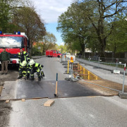 Ein großer Spalt hatte sich zwischen zwei Stahlplatten der Fahrbahnbrücke über eine Baugrube gebildet. Die Einsatzkräfte verschoben eine Platte, so dass der Spalt wieder verschlossen war und Fahrzeuge wieder gefahrlos diese Stelle passieren können. Während der Arbeiten musste die Leibstraße komplett gesperrt werden.