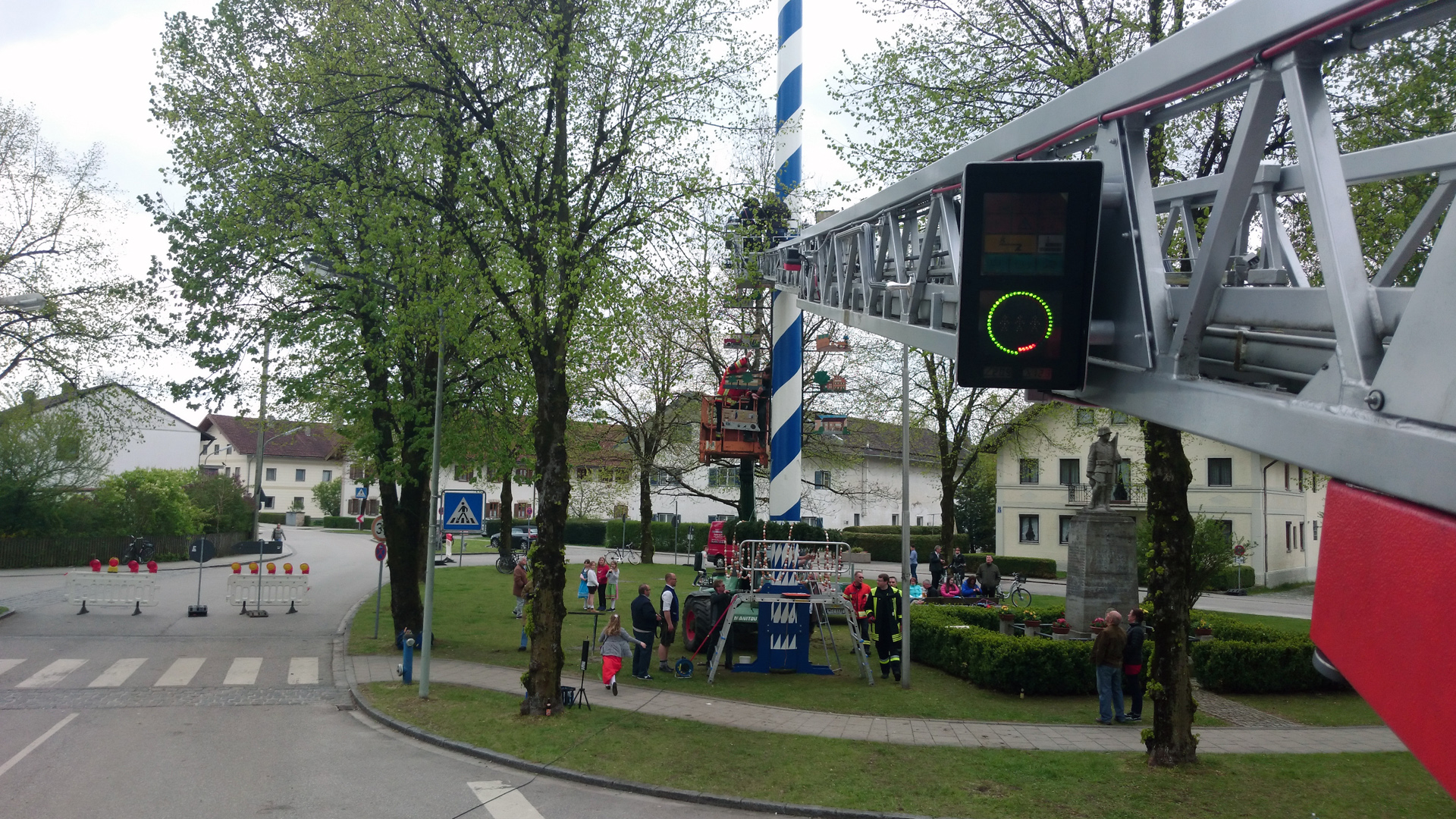 Die Feuerwehr Haar unterstützte die Gemeinde Grasbrunn beim Maibaumaufstellen mit der Drehleiter.