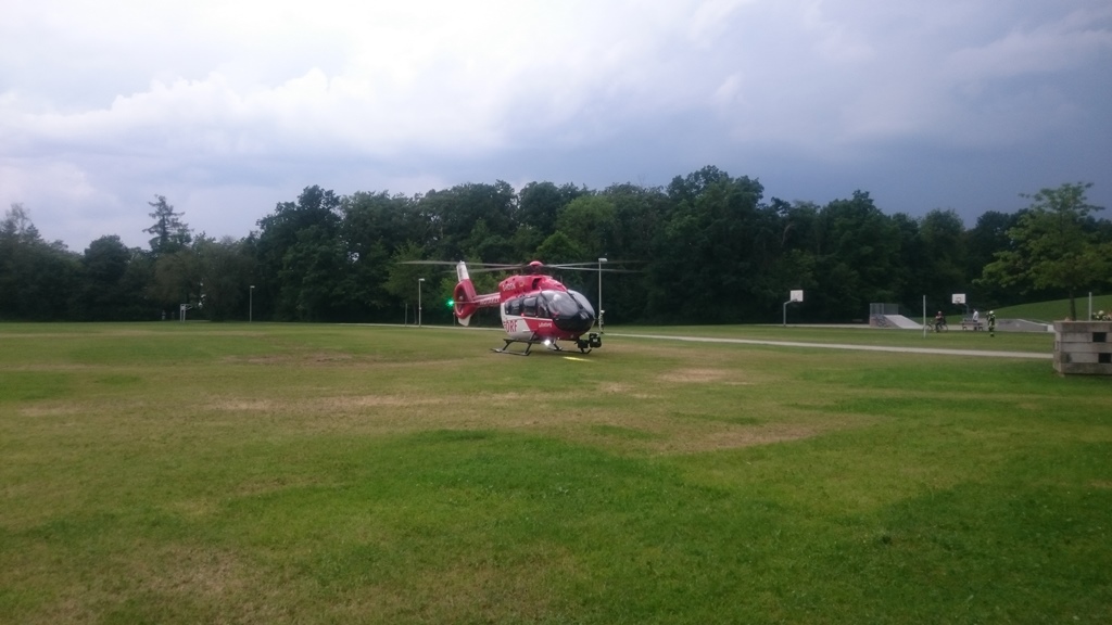 Die Feuerwehr übernahm die Besatzung des Rettungshubschraubers 'Christoph München' nach der Landung am Wieselweg und fuhr diese zu einer Einsatzstelle im Jagdfeldring. Nach dem Rettungsdiensteinsatz wurde die Besatzung wieder zurück zu ihrem Hubschrauber gefahren.