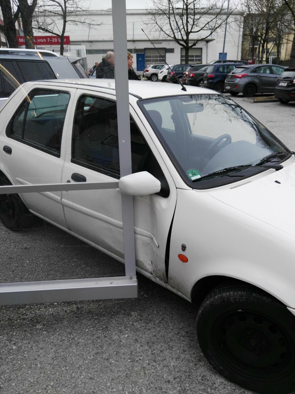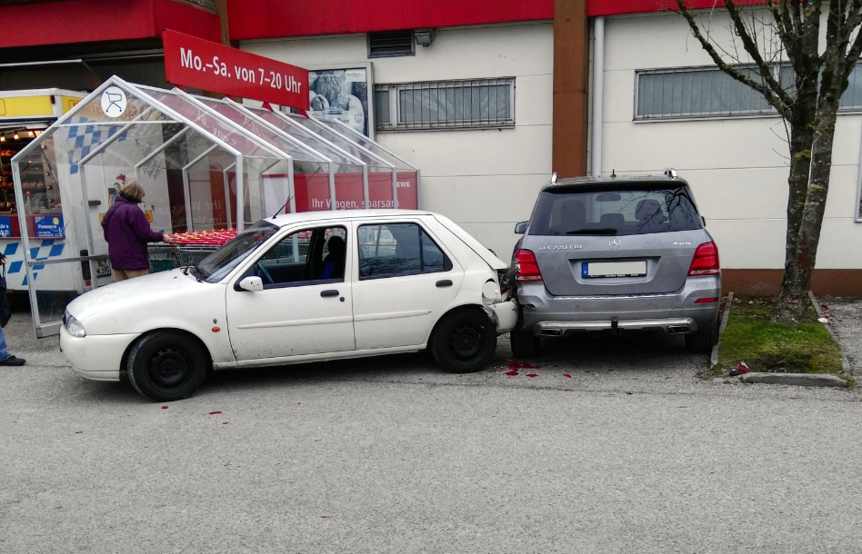 Eine Dame war mit ihrem PKW mit Automatikgetriebe beim rückwärts Ausparken in einen parkenden PKW gefahren und beschädigte dabei nicht nur beide Fahrzeuge, sondern auch den Einkaufswagenunterstand.
