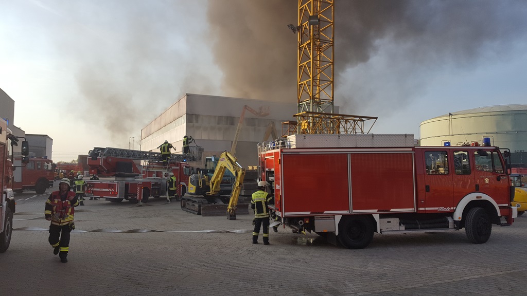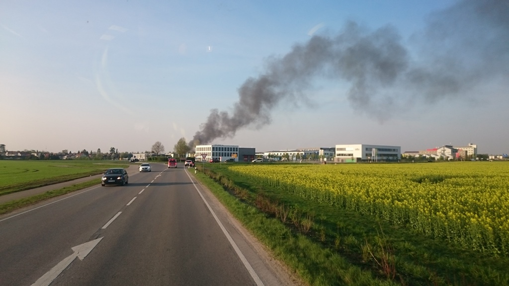 Bereits auf der Anfahrt zeigte sich eine starke Rauchentwicklung und eine hohe Rauchsäule wies den Weg. Eine Halle, in der eine Sortieranlage eines Recyclingbetriebs, untergebracht war stand in Brand.