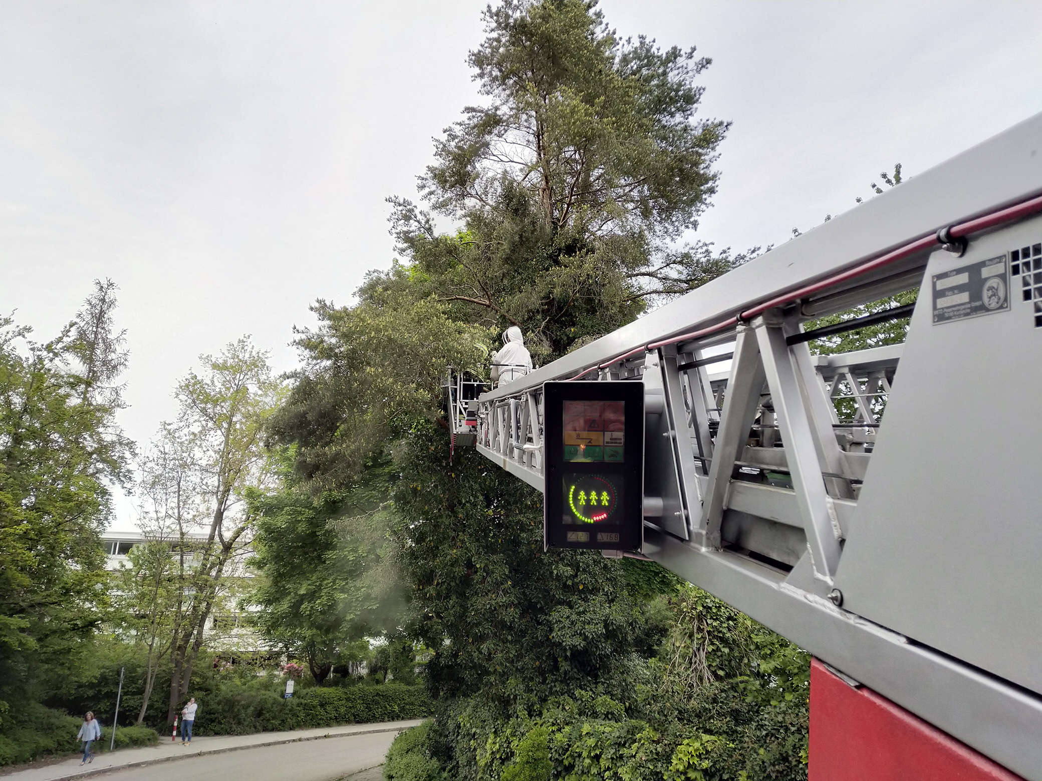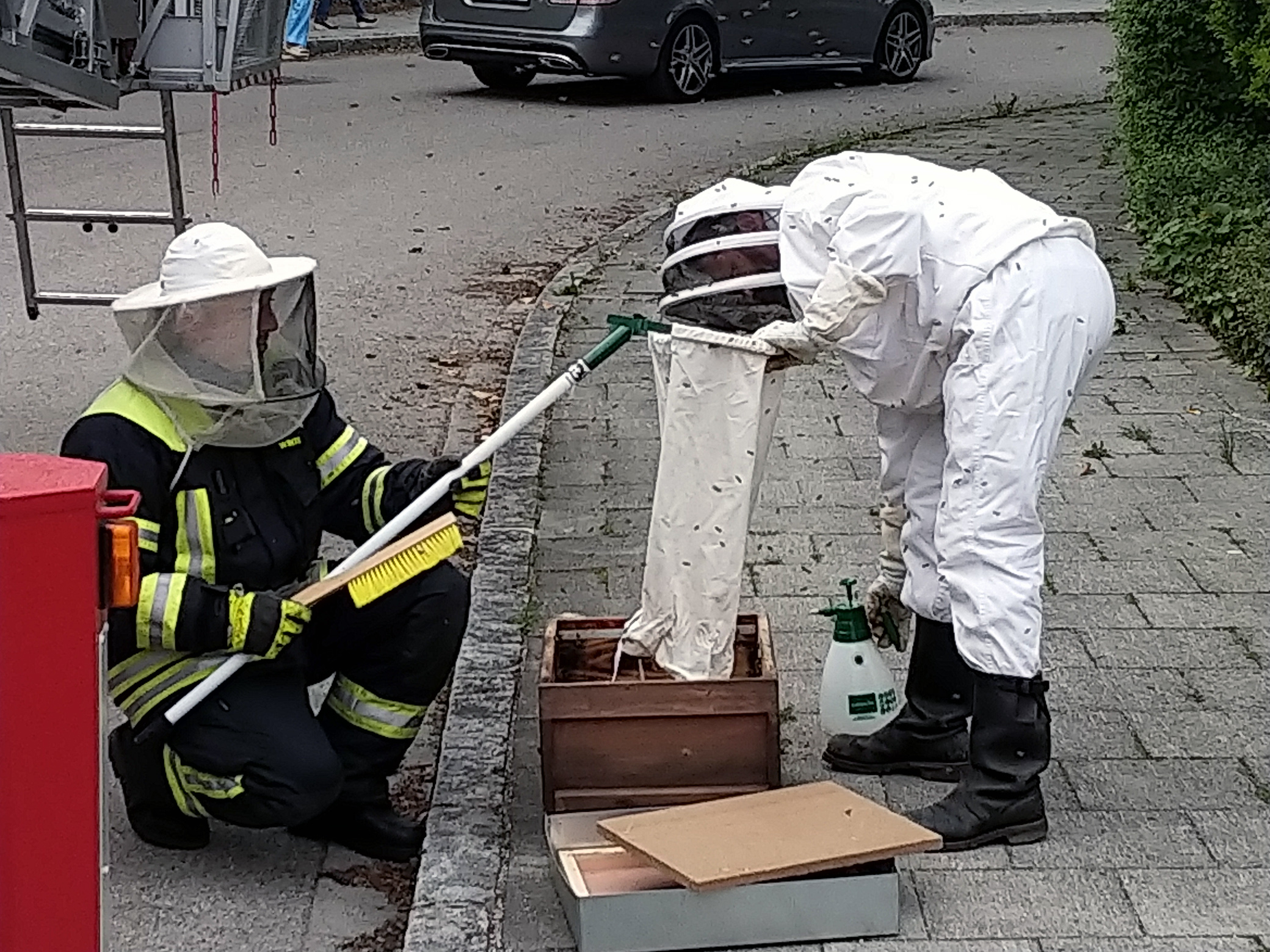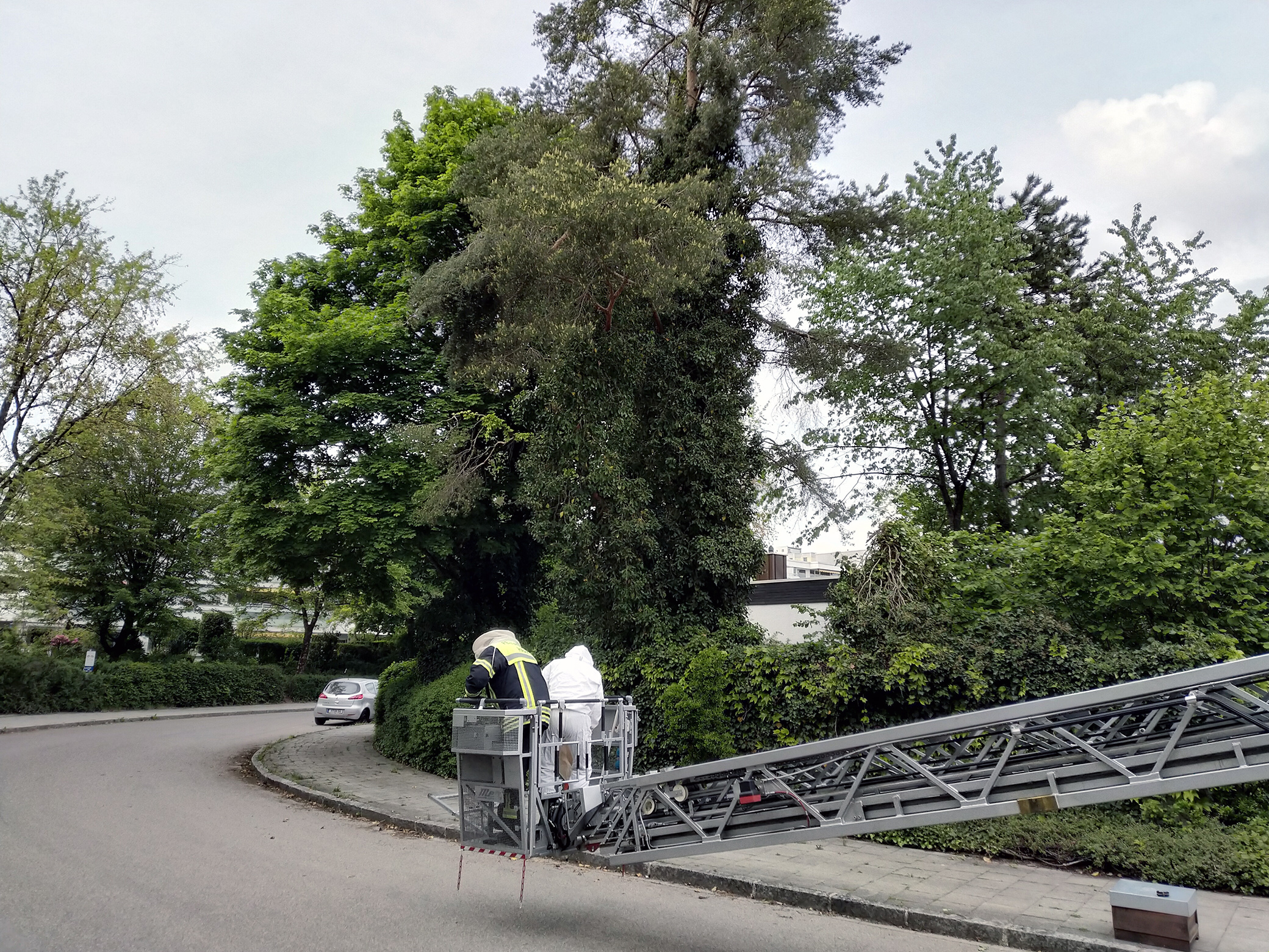 Die Feuerwehr Haar unterstützte einen Imker in der Dianastraße beim Einfangen eines schwärmenden Bienenvolkes mit der Drehleiter.