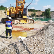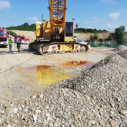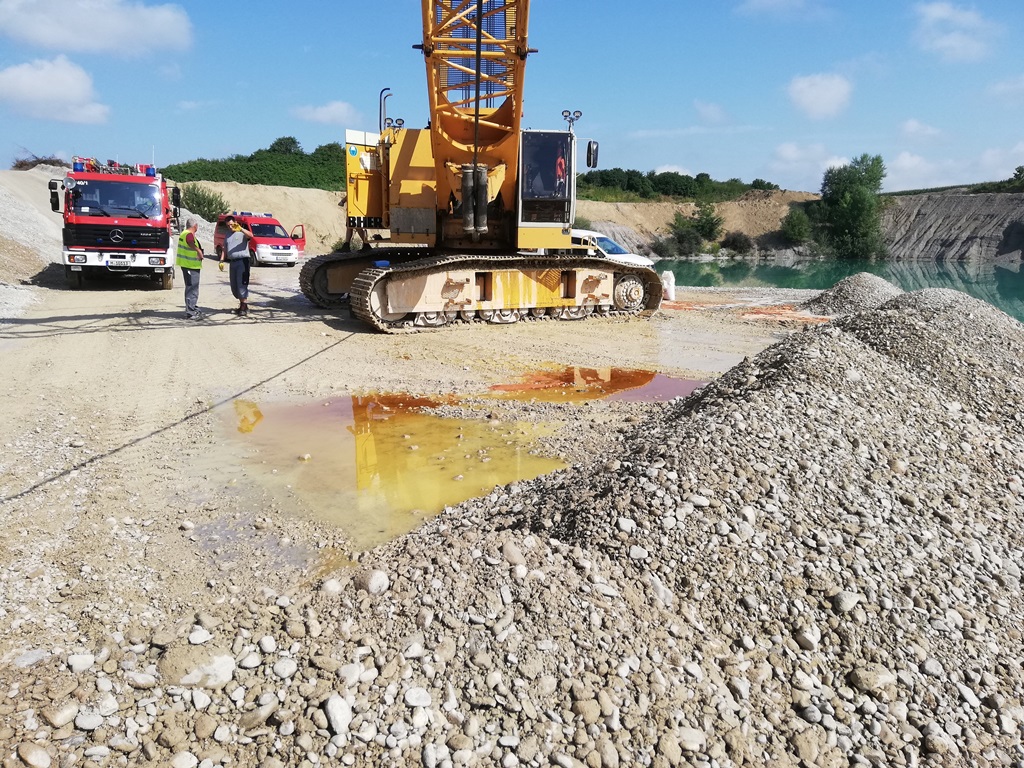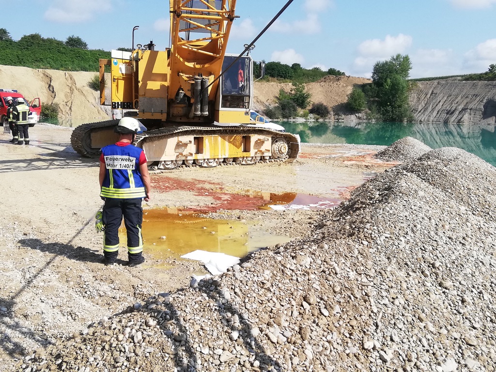 Bei einem Seilbagger war eine Hydraulikleitung geplatzt und der Bagger verlor große Mengen an Öl. Der Bagger selber stand in einer Kiesgrube nahe der Abbruchkante in den Baggersee, aus dem mit dem Gerät Kies abgebaut wurde. Bei Eintreffen der Einsatzkräfte aus Haar hatten die Mitarbeiter bereits vorsorglich eine Kies-Barriere zwischen Wasser und Öl aufgebaut, um ein unkontrolliertes Verunreinigen von Wasser zu vermeiden.