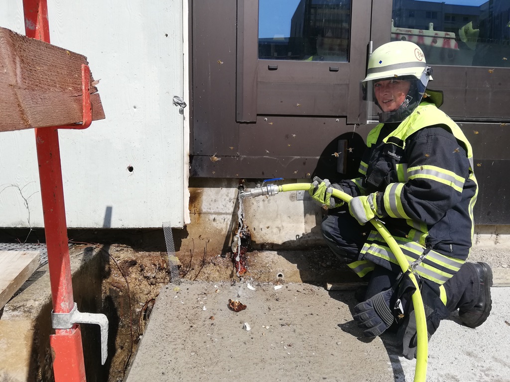 Vor Ort stellte sich heraus, dass ein sog. Rauchansaugsystem (RAS) ausgelöst hatte, nachdem bei Bauarbeiten versucht wurde, einen Bienenschwarm mit einem Gasbrenner zu beseitigen. Unglücklicherweise hatte sich der Schwarm in einer Dehnungsfuge zwischen den Betonfertigteilen eingenistet. Beim Versuch der Beseitigung fing die Isolierung in der Fuge Feuer und es entwickelte sich Rauch, der die Brandmeldeanlage auslösen ließ.