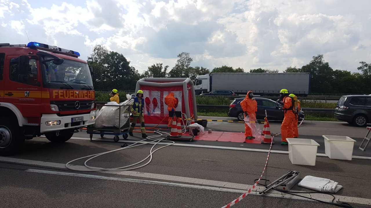 Beim Eintreffen der Einsatzkräfte aus Haar fanden sie einen Auffahrunfall mit stark deformierten Fahrerkabinen zweier LKW vor. Die Ladung zweier Fahrzeuge war über die Fahrbahn verteilt, darunter auch geplatzte Fässer gefüllt mit Epoxidharz, das giftige Dämpfe entwickelte. Mit schwerem Gerät musste der Fahrer aus seiner Kabine geschnitten werden und konnte anschließend mit dem Rettungshubschrauber abtransportiert werden. Gleichzeitig begann die Sicherung der Ladung unter schwerem Atemschutz in Schutzanzügen.