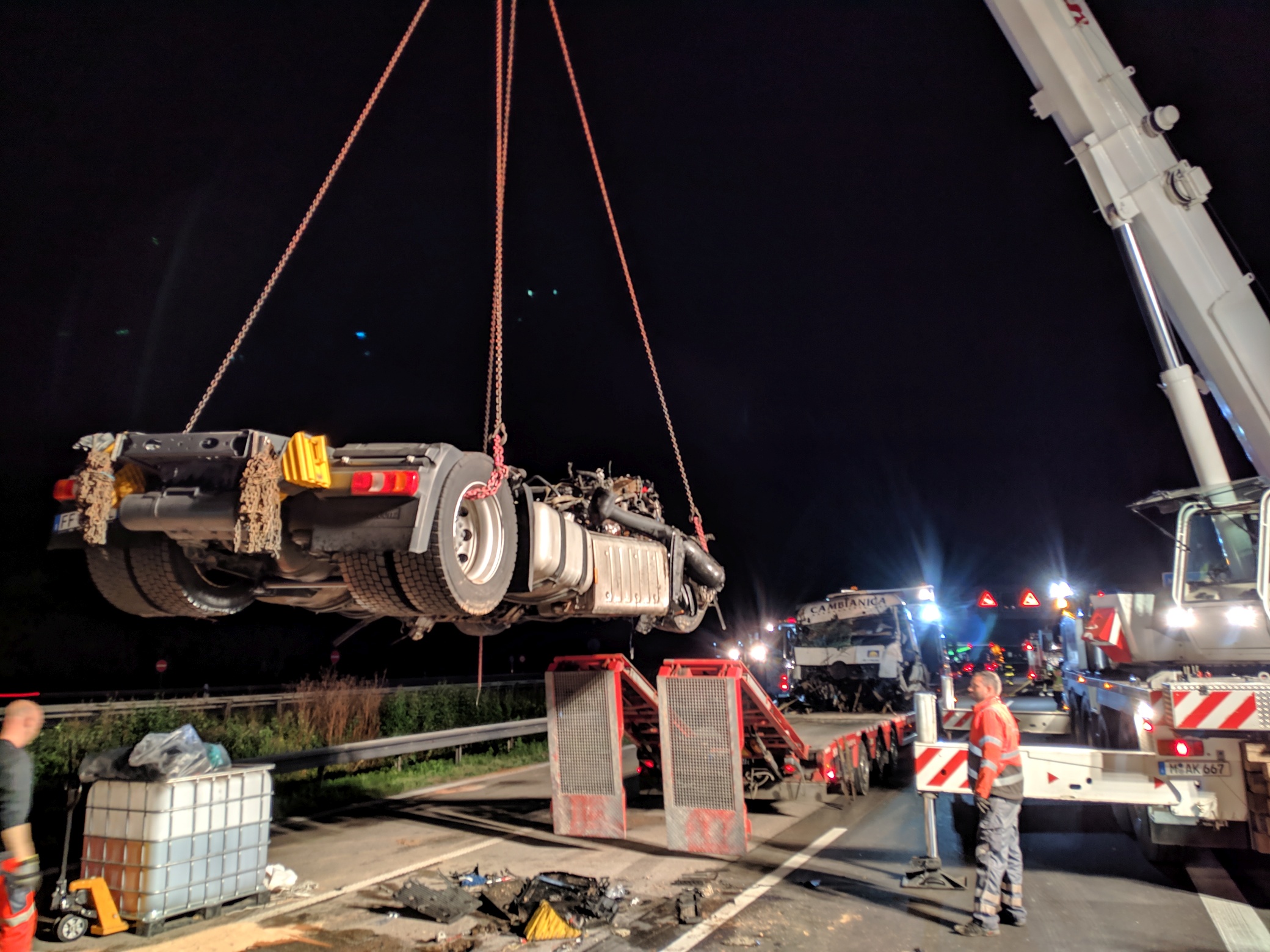 Die Bergungsarbeiten des Einsatzes vom Mittag (#253) waren noch immer nicht abgeschlossen, das LKW-Bergeunternehmen konnte die havarierte Sattelzugmaschine nicht abtransportieren, bevor die Diesel-Tanks leer gepumpt waren. Die Feuerwehr Haar rückte mit einer speziellen Pumpe und einem IBC-Container an, um diese Arbeit zu erledigen. Sämtliche Tanks wurden geleert und ca. 700 l Kraftstoff abgepumpt. Anschließend konnte das Fahrzeug mit einem Kran auf einen Tieflader zum Abtransport gehoben werden und die Einsatzkräfte aus Haar wieder abrücken.