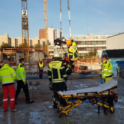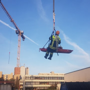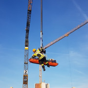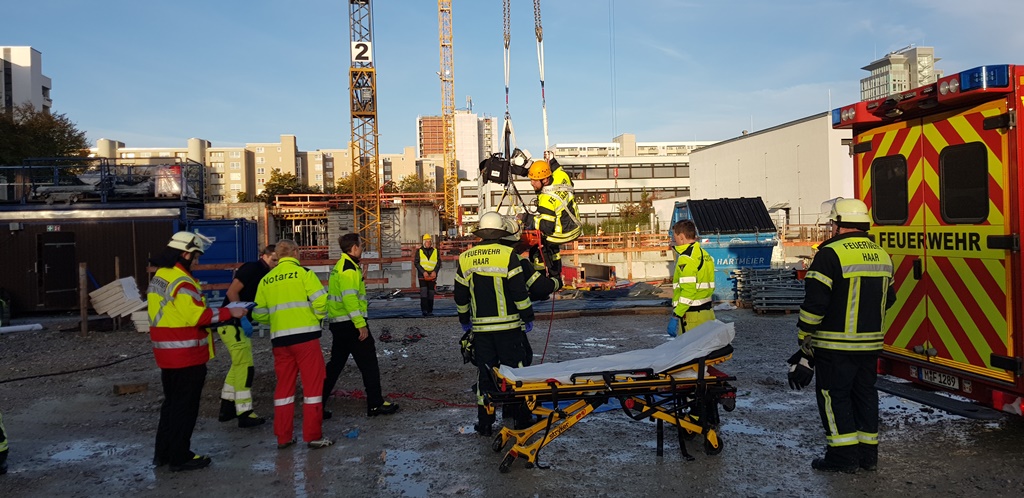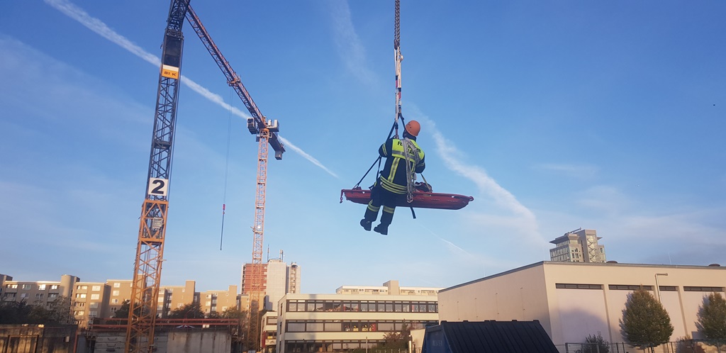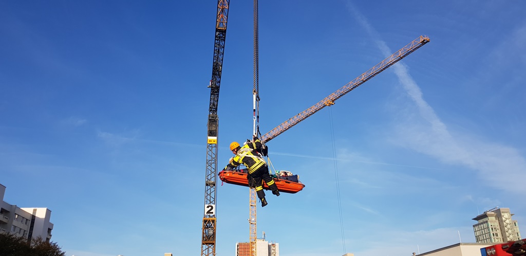 Aufgrund der schwer zugänglichen Stelle auf der Baustelle, musste die Schleifkorbtrage am Turmdrehkran befestigt werden und konnte nur so zum Verletzten gebracht werden. Anschließend erfolgte auch der weitere Transport mittels des Krans auf der Baustelle.
