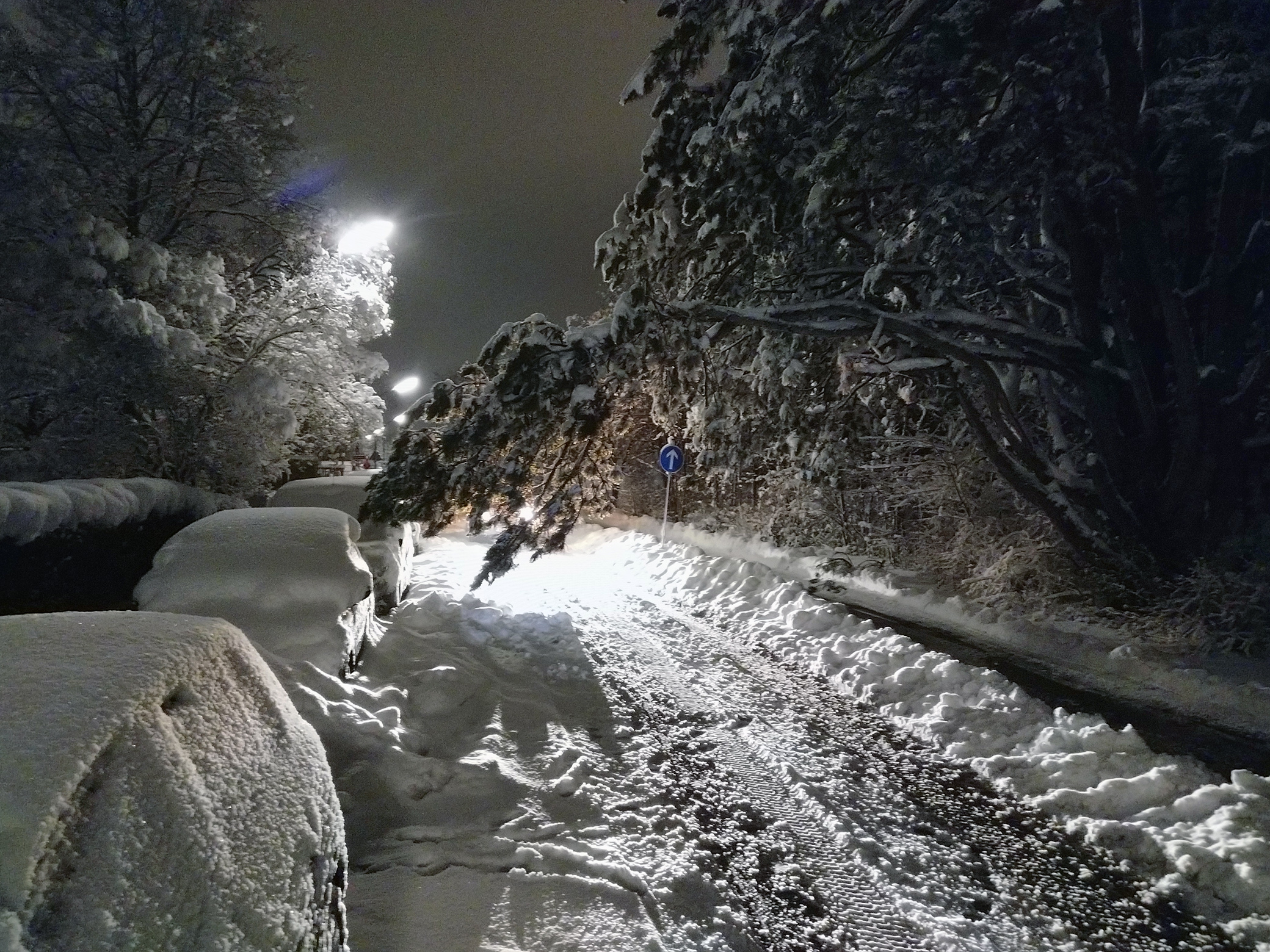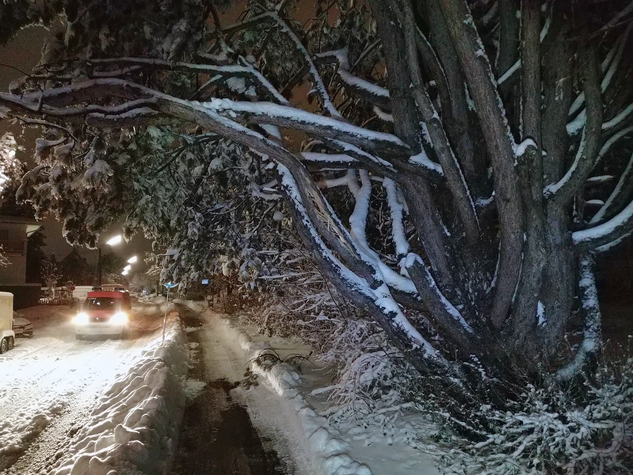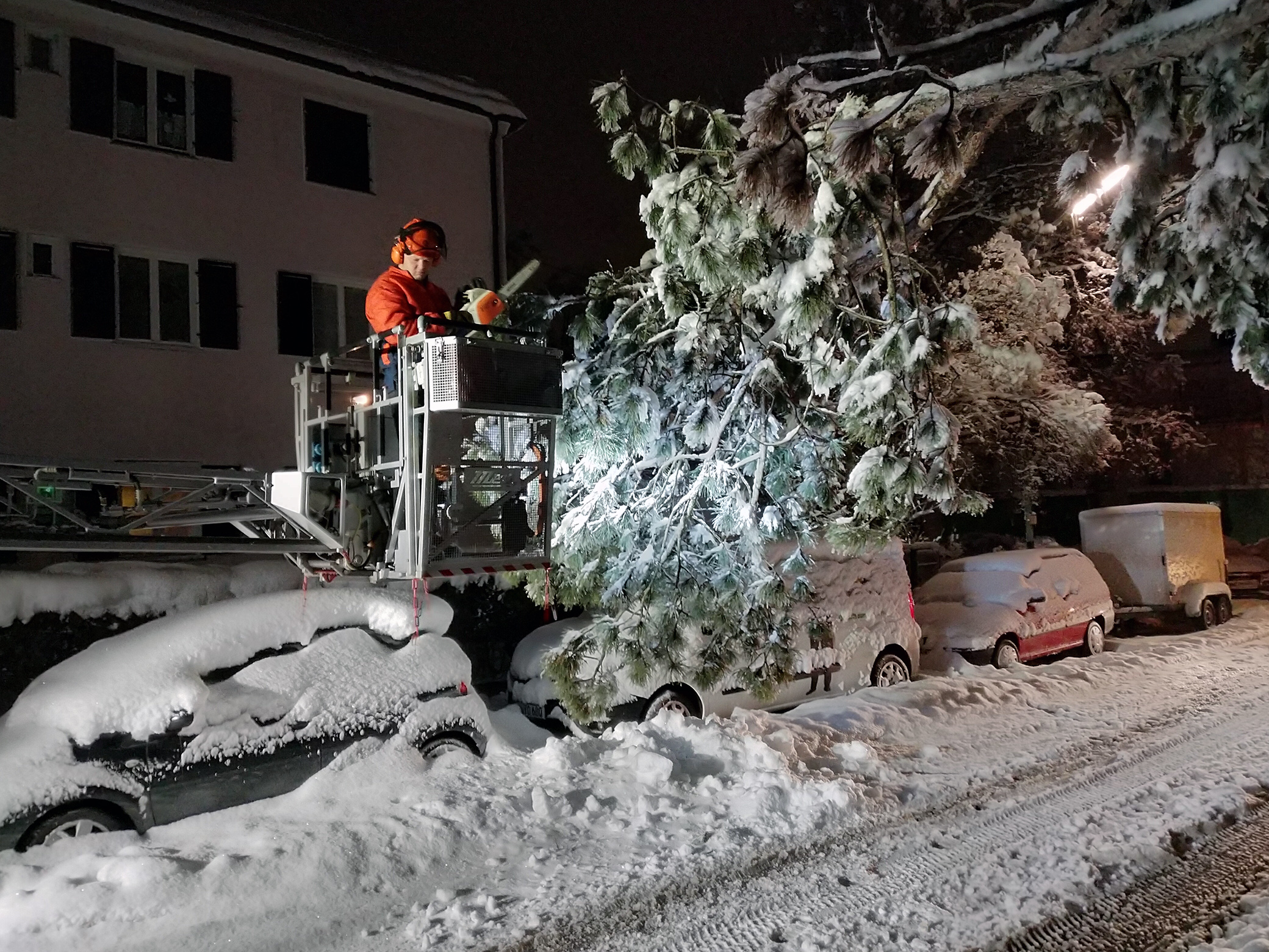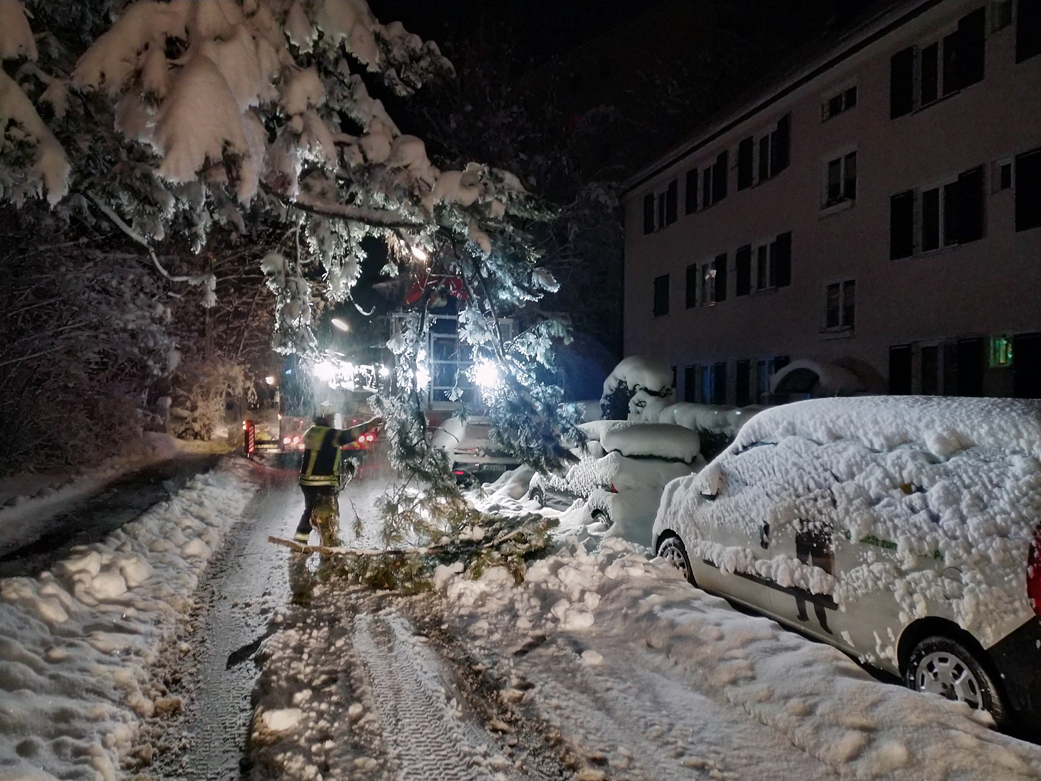 Beim Schneeräumen entdeckte ein Bürger einen Ast, der bedrohlich über die Gronsdorferstraße hing. Die Feuerwehr Haar rückte mit der Drehleiter an und entfernte den Ast. Weitere Äste mussten von der Schneelast befreit werden, bevor die Straße wieder sicher zu befahren war.