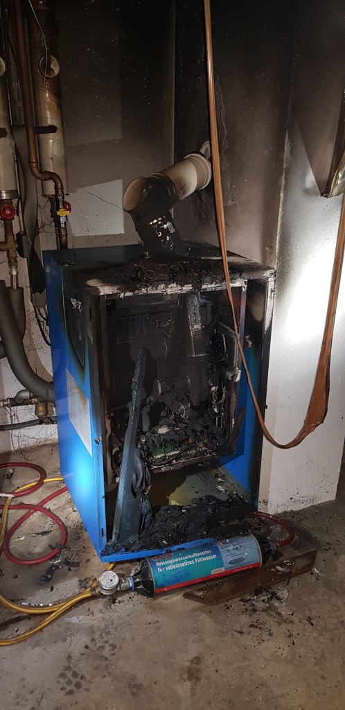 Ein Angriffstrupp unter schwerem Atemschutz drang in den Keller des Gebäudes vor, konnte aber kein offenes Feuer mehr entdecken. Der Trupp bestätigte aber einen vorangegangenen Brand an der Heizungsanlage. Die Einsatzkräfte riegelten die Gaszufuhr in das Gebäude ab und führten eine natürliche Belüftung durch. Anschliessend durchgeführte Messung auf evtl. ausgetretenes Gas blieben negativ. Nach der Kontrolle der Räumlichkeiten mit einer Wärmebildkamera ohne Vorkommnisse, konnte die Einsatzstelle an die Polizei übergeben werden und die Einsatzkräfte wieder einrücken.