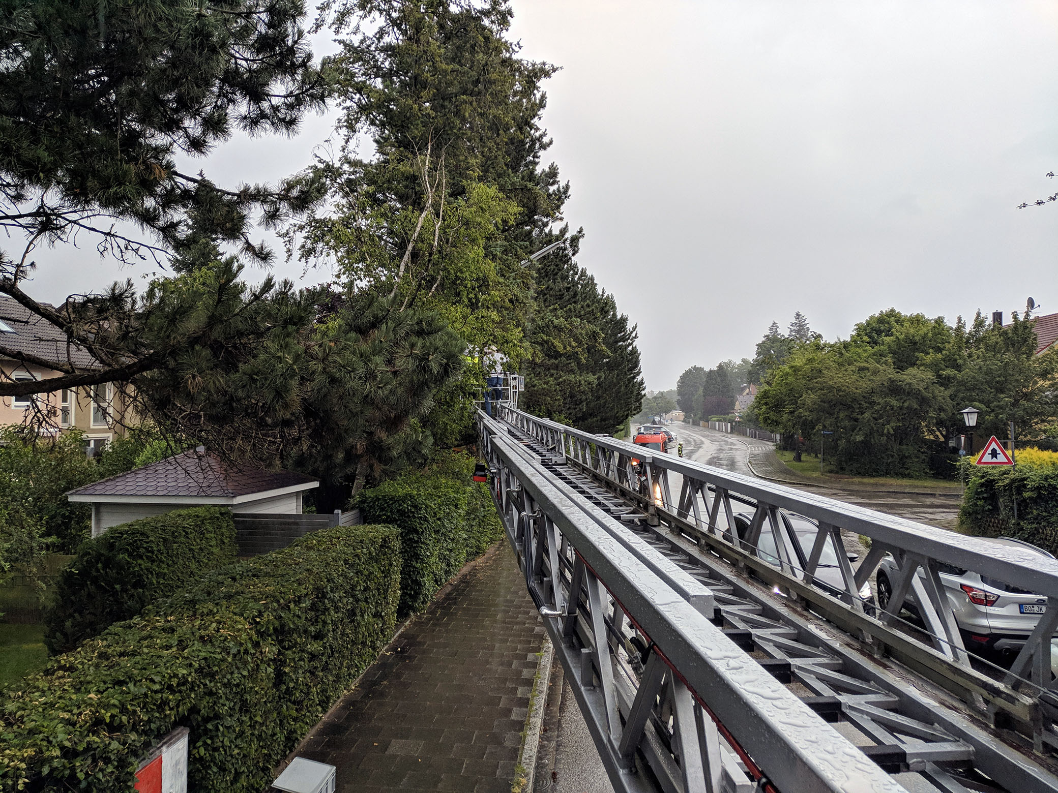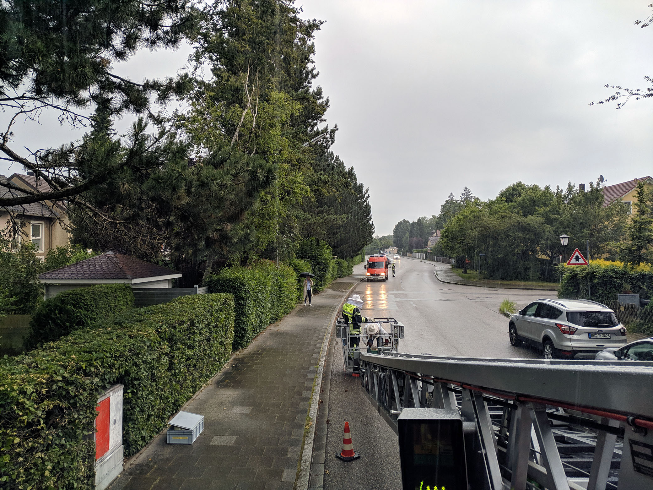 Vor Ort konnte der Bienenschwarn, der sich an einem dicken Ast gesammelt hatte, aus dem Drehleiterkorb eingefangen werden. Ein Imker kümmert sich nun um das Volk. Durch die Enge der Straße musste während der Arbeiten eine wechselseitige Einbahnregelung eingerichtet werden und die Einsatzkräfte der Feuerwehr Haar regelten den Verkehr.