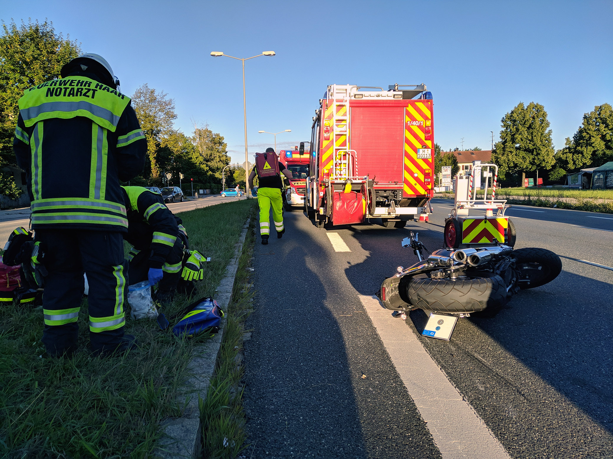 Ein Motorradfahrer war bei einem Bremsmanöver mit seinem Motorrad gestürzt und hatte sich dabei unter anderem einen Beinbruch zugezogen. Der Feuerwehrarzt und medizinisch geschultes Personal der Feuerwehr Haar übernahmen zusammen mit dem ebenfalls alarmierten Rettungsdienst die Erstversorgung des Fahrers. Während der Rettungsarbeiten musste eine Fahrspur der B304 gesperrt werden. Nach dem Abtransport des Verletzten und der erfolgten Unfallaufnahme durch die Polizei konnte das Motorrad abgeschleppt und anschließend die Straße wieder für den Verkehr frei gegeben werden.