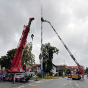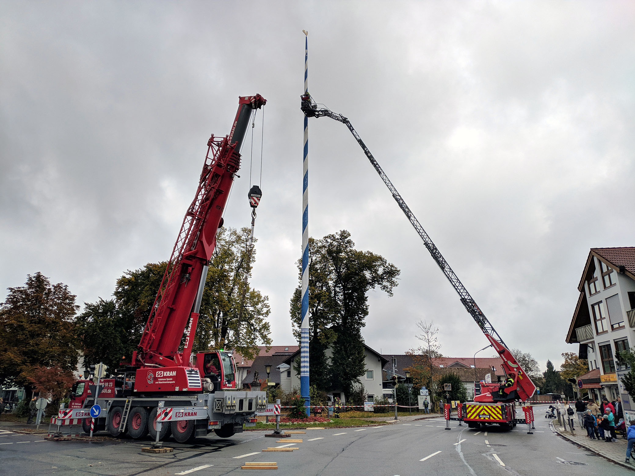 Die Drehleiter der Feuerwehr Haar unterstützte in Putzbrunn bei der Demontage des Maibaumes.