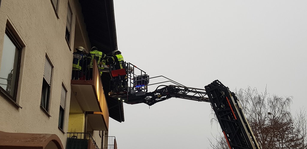 Vor Ort musste eine Person liegend auf einer Trage aus einem oberen Stockwerk transportiert werden. Die Feuerwehr erledigte dies mit Hilfe der Krankentragehalterung an der Drehleiter und brachte sie vom Balkon aus auf Bodenniveau. Die Person konnte anschließend wieder an den Rettungsdienst übergeben werden, der sie in ein Krankenhaus brachte.
