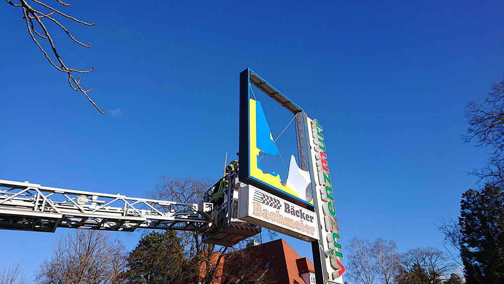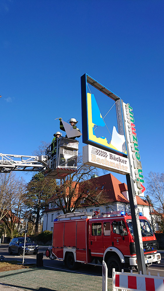 Hier hatte der Sturm eine Leuchtreklame eines Ladengeschäftes derart beschädigt, dass die "Reste" mit Hilfe der Drehleiter entfernt werden mussten, so dass keine weitere Gefahr mehr von ihr ausging.