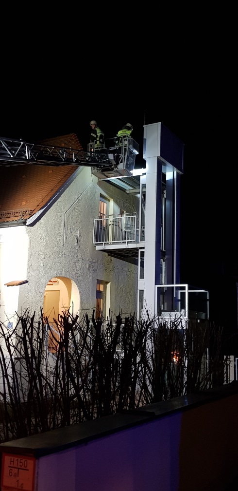 Über die Drehleiter gelangten die Einsatzkräfte der Feuerwehr Haar zur Klappe und konnten das Teil mit einem Spanngurt provisorisch sichern. Während der Arbeiten musste die B471 teilweise gesperrt werden und eine Verkehrslenkung eingerichtet werden.