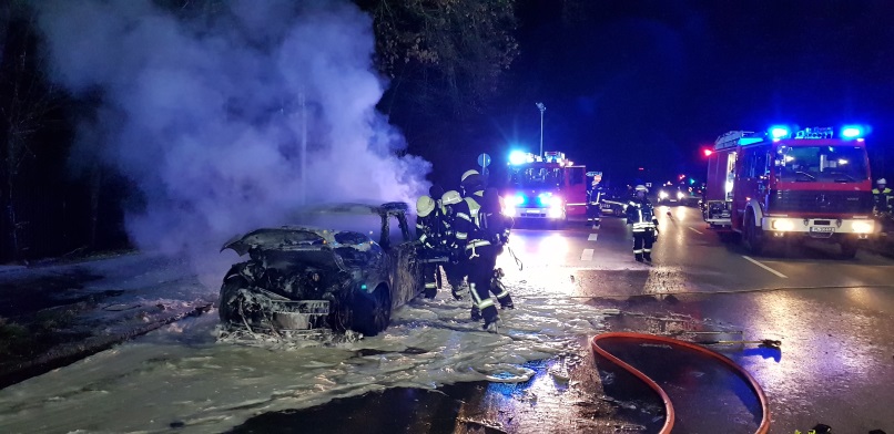 Bei Eintreffen der ersten Einsatzkräfte stand 1 PKW in Vollbrand. Zwei Trupps unter schwerem Atemschutz begannen umgehend mit der Brandbekämpfung und öffneten das Auto mittels hydraulischem Spreizer. Nach dem das Fahrzeug abgelöscht war, wurde noch nach auslaufenden Betriebsstoffen kontrolliert und die Straße gereinigt, bevor die Einsatzstelle anschließend an die Polizei übergeben werden konnte.