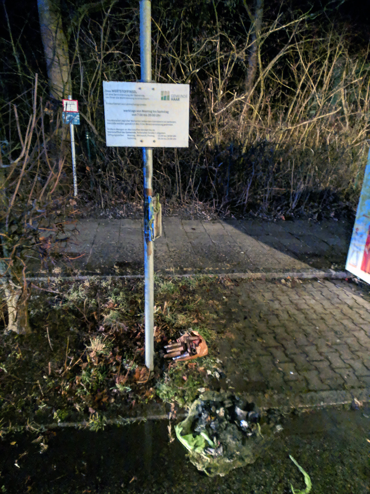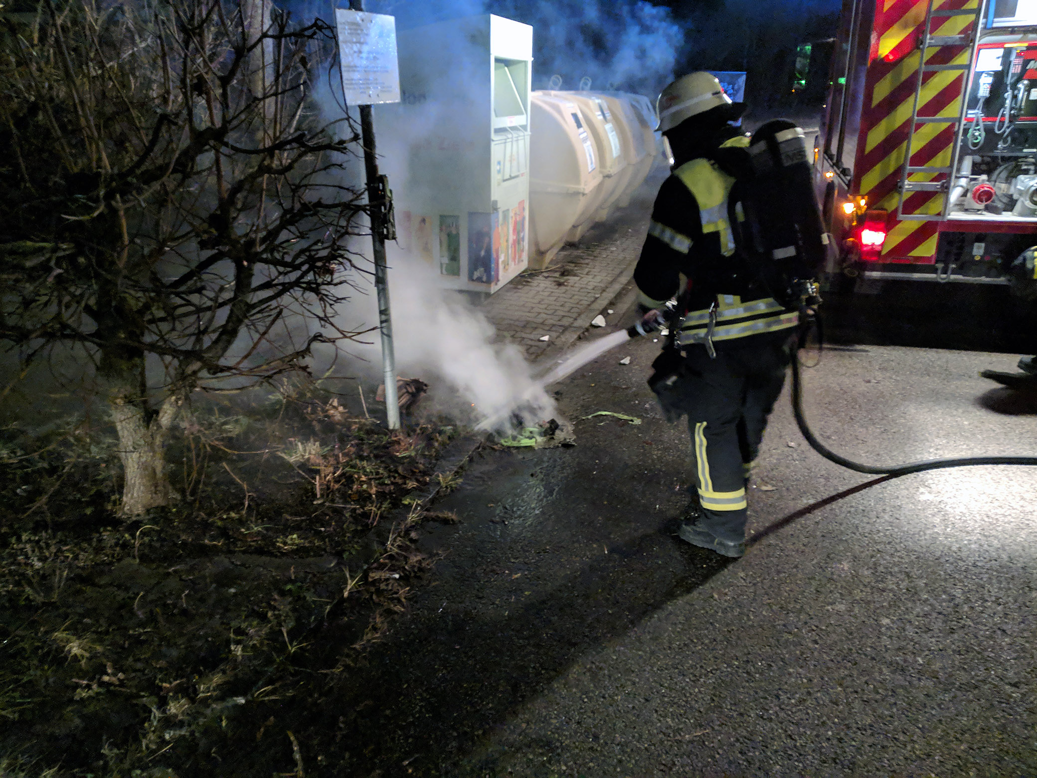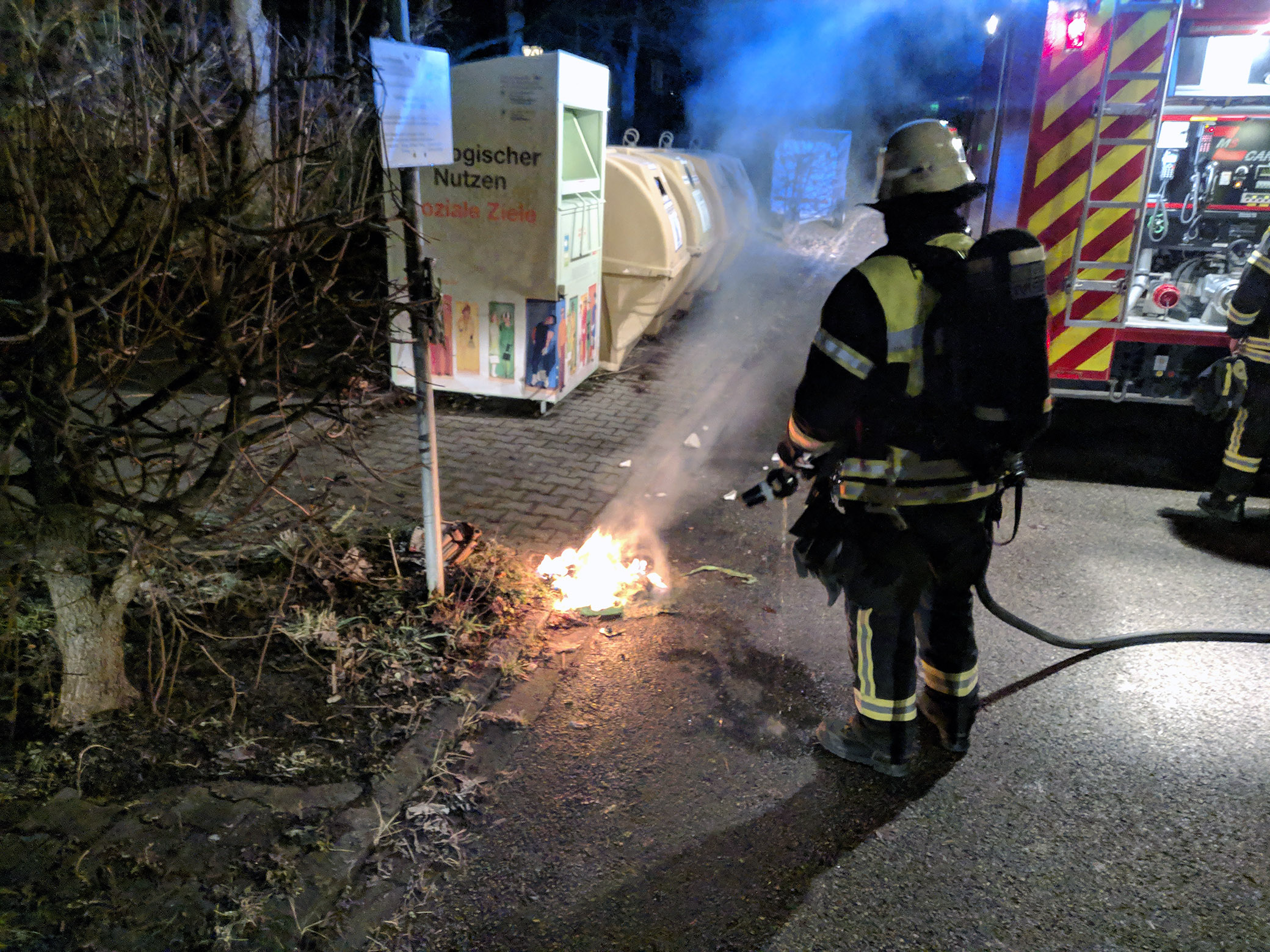 Gemeldet war ein Feuerschein nördlich des Wieselwegs. Letztendlich war ein Mülleimer neben einer Recycling-Insel im Hubertusweg in Brand. Mit dem Schnellangriff des Löschgruppenfahrzeugs war das Feuer rasch gelöscht. Zur Sicherheit kontrollierten die Einsatzkräfte noch die nebenanstehenden Container mit einer Wärmebildkamera auf eventuelle Wärmestellen. Nachdem dort keine Feststellung gemacht wurde, konnten die Einsatzkräfte der Feuerwehr Haar wieder abrücken.