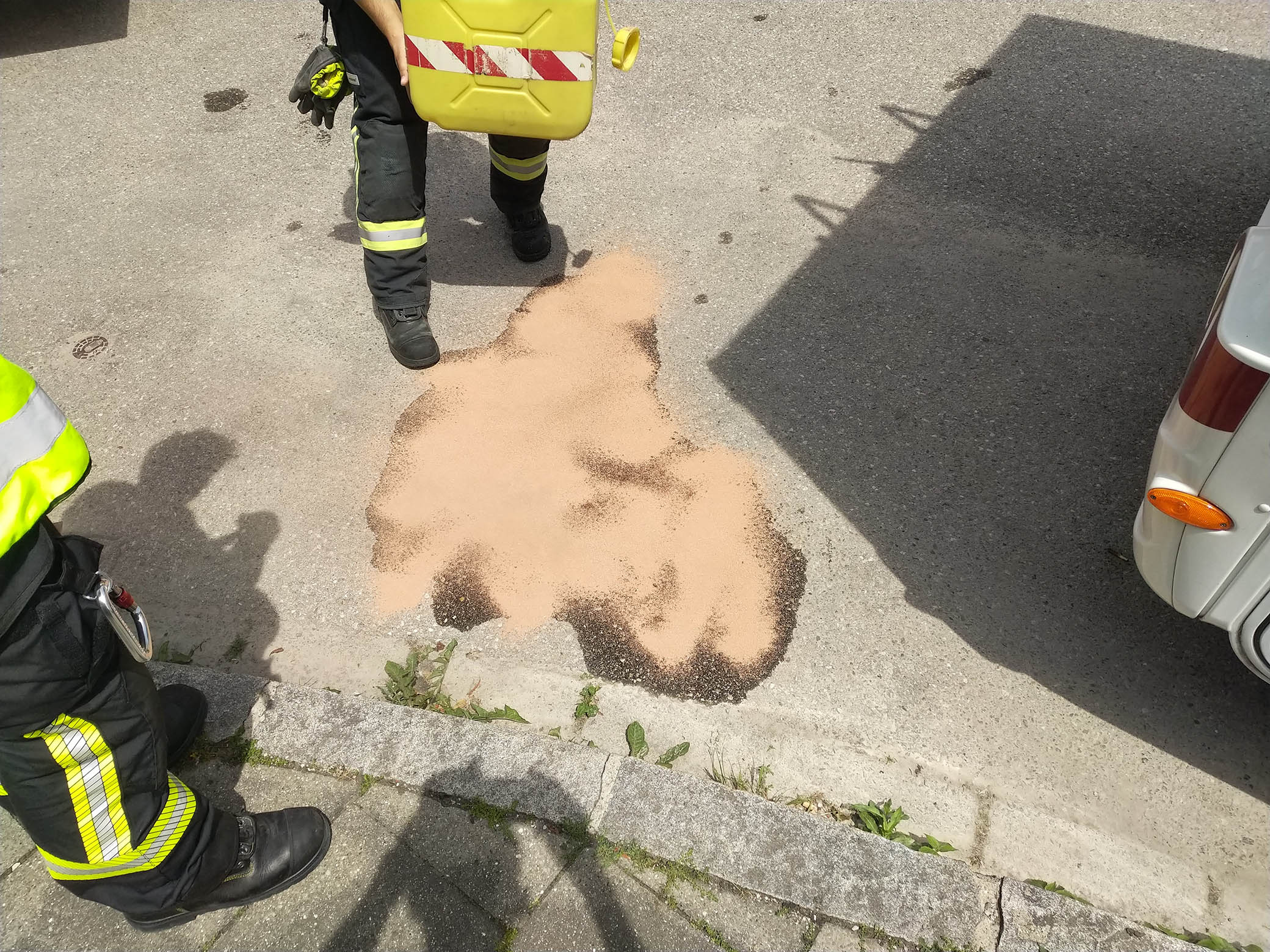 Ein unbekanntes Fahrzeug hatte auf der Straße einen Ölfleck hinterlassen, der mit Bindemittel aufgenommen werden musste.