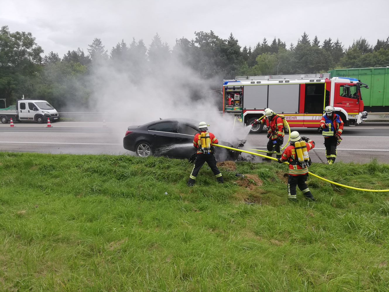 Ein PKW war während der Fahrt in Brand geraten und musste auf den Standstreifen ausweichen. Die vier Insassen konnten unverletzt das Fahrzeug verlassen. Im Motorraum war ein Brand ausgebrochen, den die Einsatzkräfte aus Grasbrunn unter Atemschutz ablöschen mussten. Die Kräfte aus Haar sicherten die Einsatzstelle gegen den fließenden Verkehr ab und stellten die Atemschutzreserve.