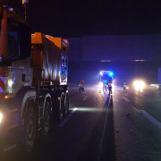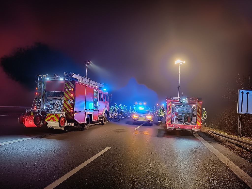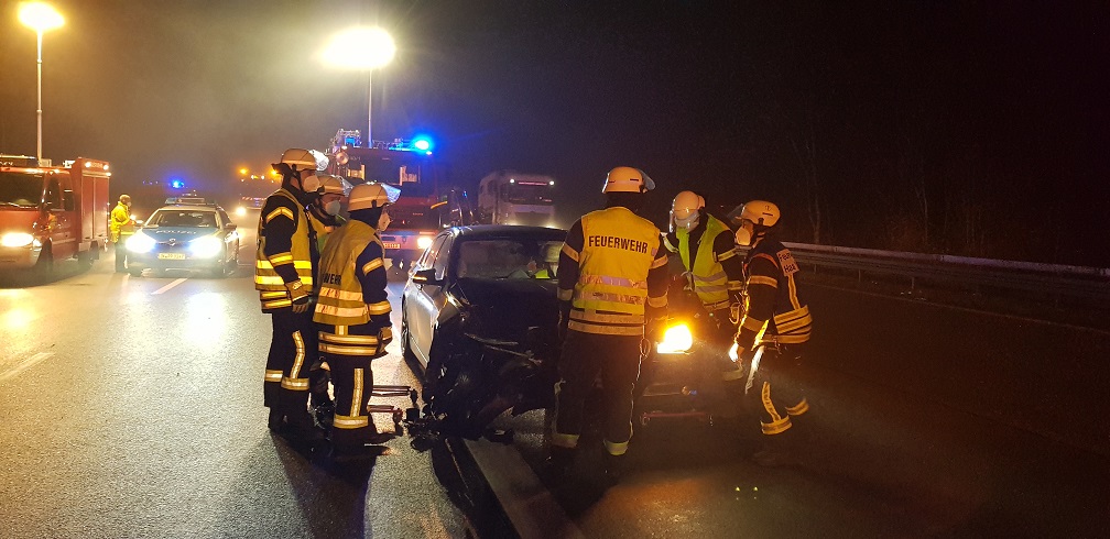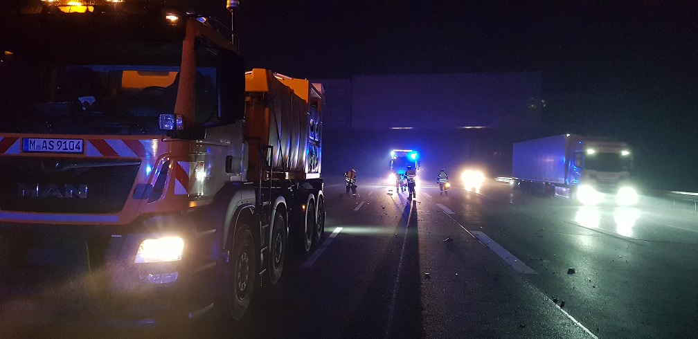 Fahrspuren der Autobahn wurde abgesperrt und von Trümmerteilen der Unfall-Pkw gereinigt.
