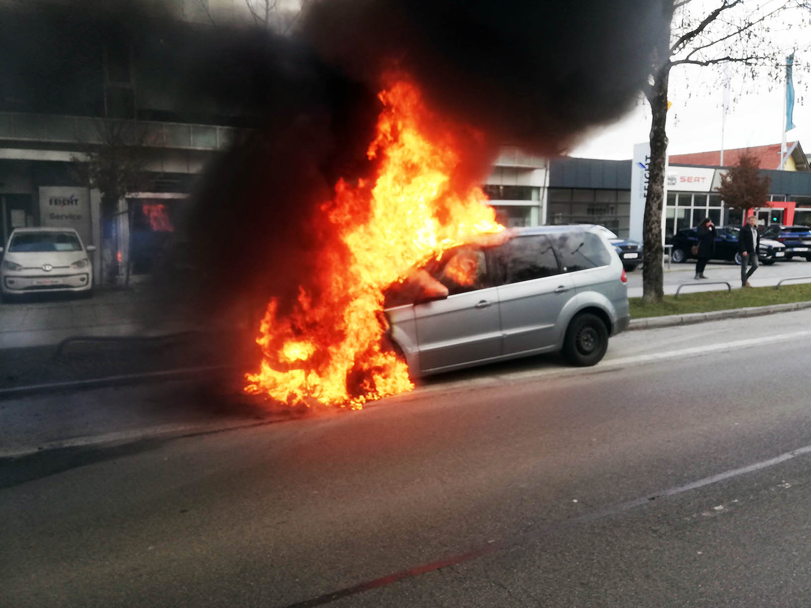 Aus noch ungeklärter Ursache war ein Fahrzeug während der Fahrt in Brand geraten, der Fahrer reagierte vorbildlich und brachte sein Fahrzeug in einer Parkbucht neben der Straße zum Stehen. Alle Insassen konnten unverletzt das Fahrzeug verlassen, der PKW begann aber stark im Motorraum zu brennen. Zusätzlich entwickelte sich dichter schwarzer Rauch.