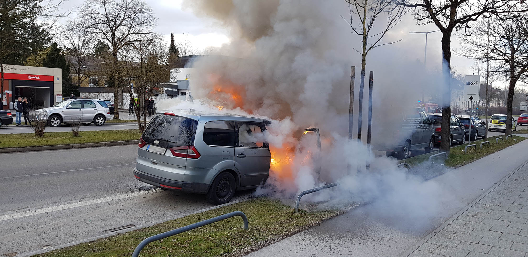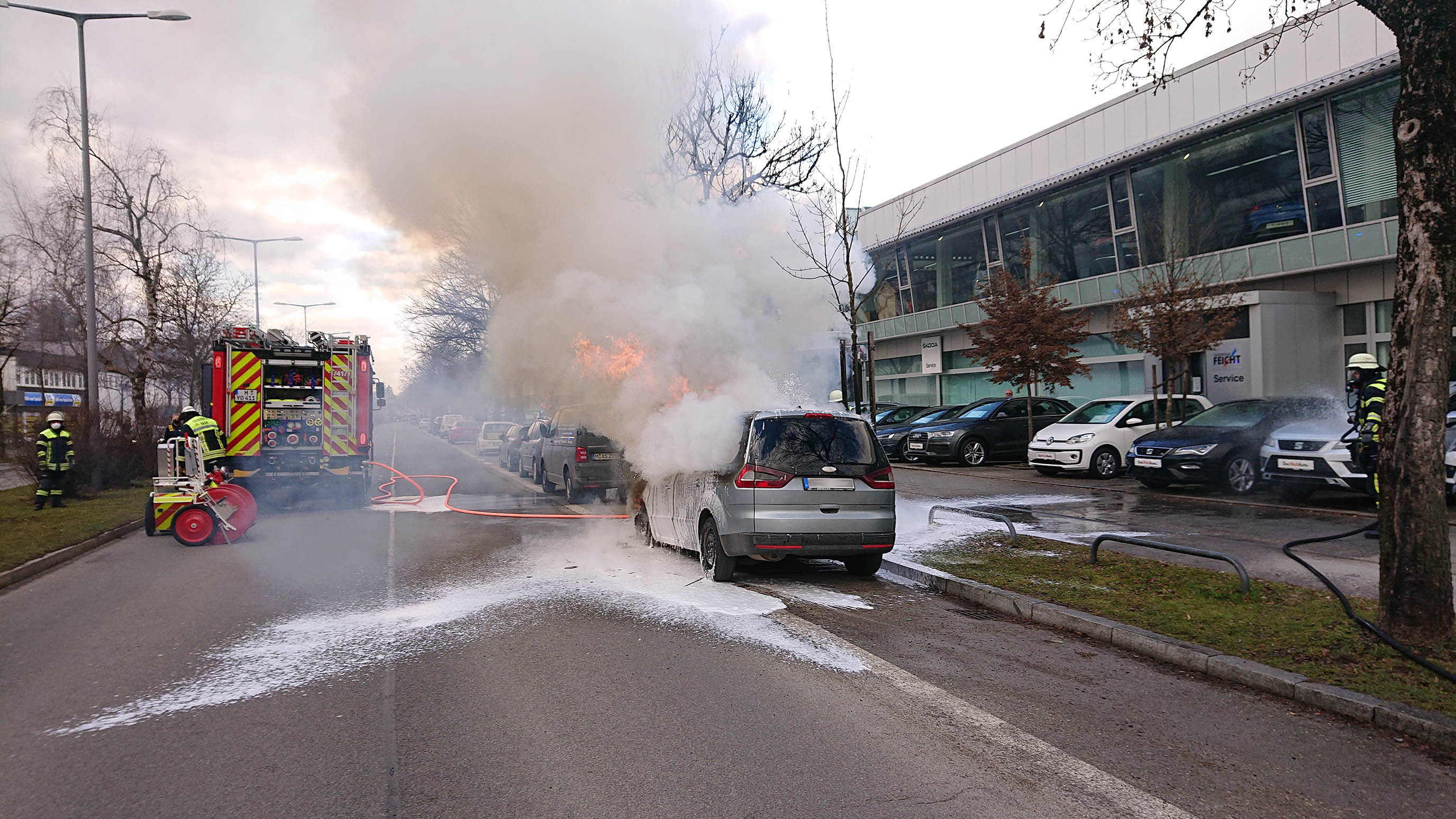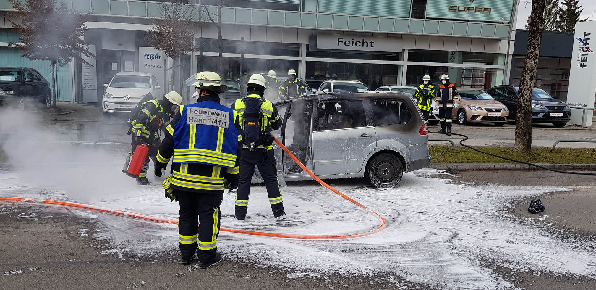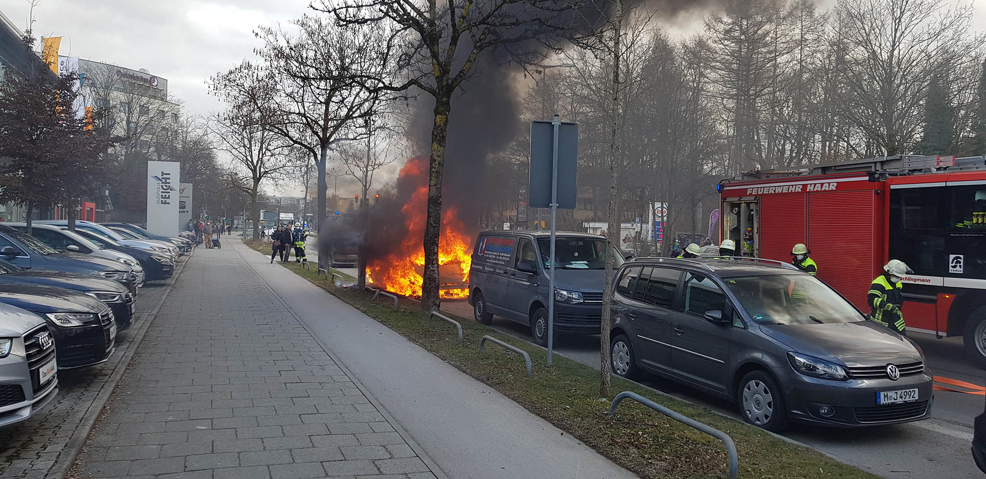Die Feuerwehr Haar begann sofort nach Eintreffen mit den Löscharbeiten von zwei Seiten unter schwerem Atemschutz und konnte ein Übergreifen des Feuers auf die umstehend geparkten Fahrzeuge verhindern.