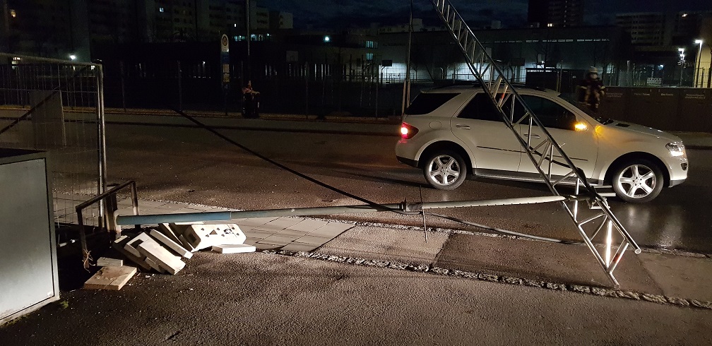 Beim Umstürzen streifte diese ein Fahrzeug. Es wurde dabei niemand verletzt. Die Feuerwehr demontierte die Kabelbrücke und versetze den Elektroverteiler, so dass die Strasse wieder frei war.