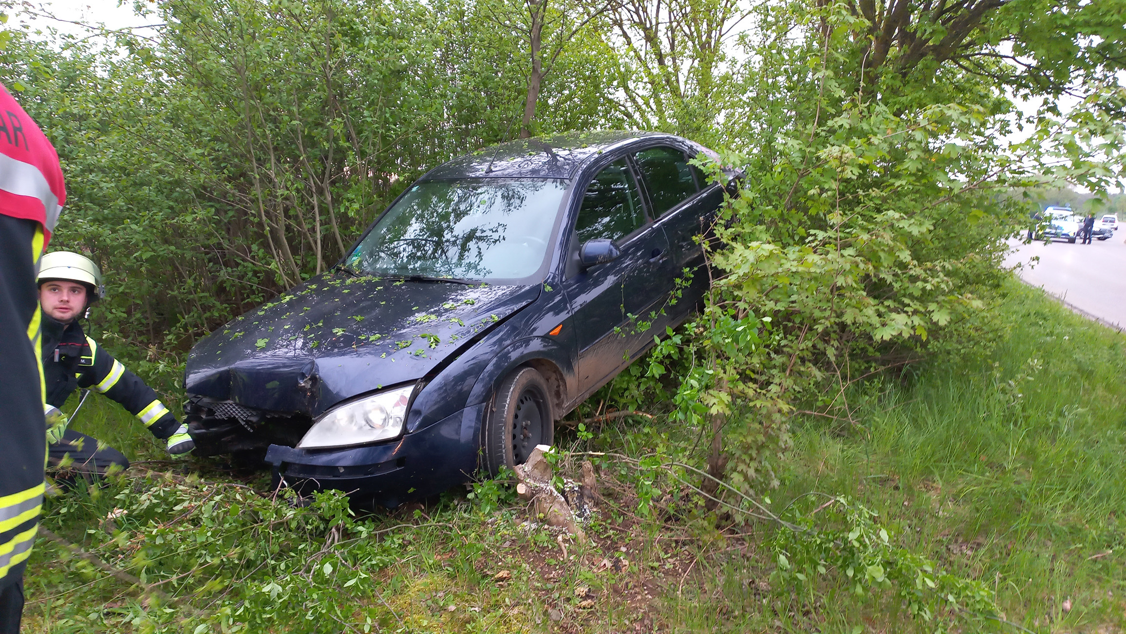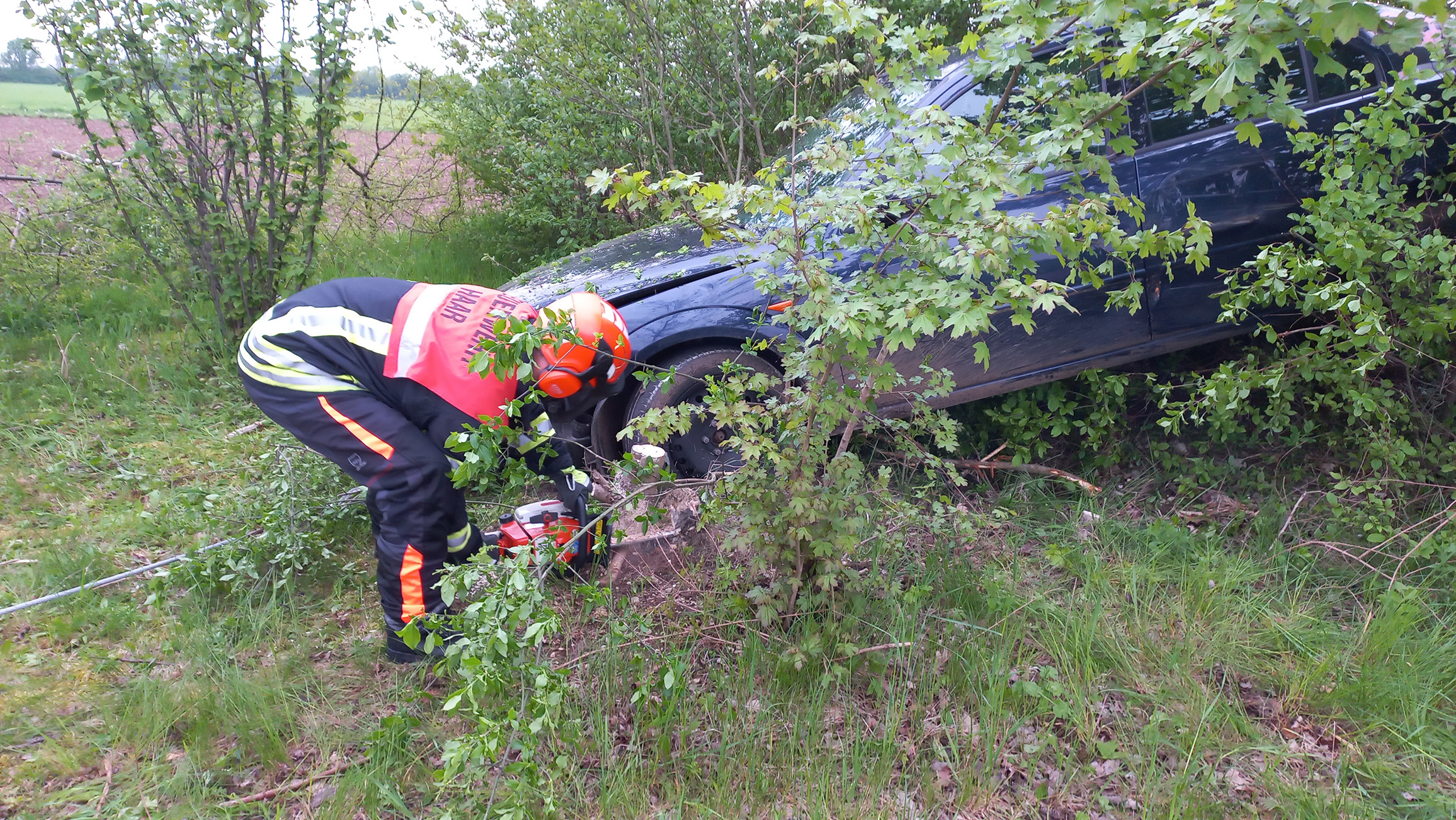 Die Polizei forderte die Feuerwehr nach, um einen verunfallten PKW aus einem Gebüsch wieder zurück auf die Straße zu befördern. Zuerst musste mit einer Kettensäge das Gebüsch zurück geschnitten werden, um an das Fahrzeug zu kommen. Anschließend konnte mit der Seilwinde des Rüstwagens das Fahrzeug wieder zurück auf die Straße gezogen werden.