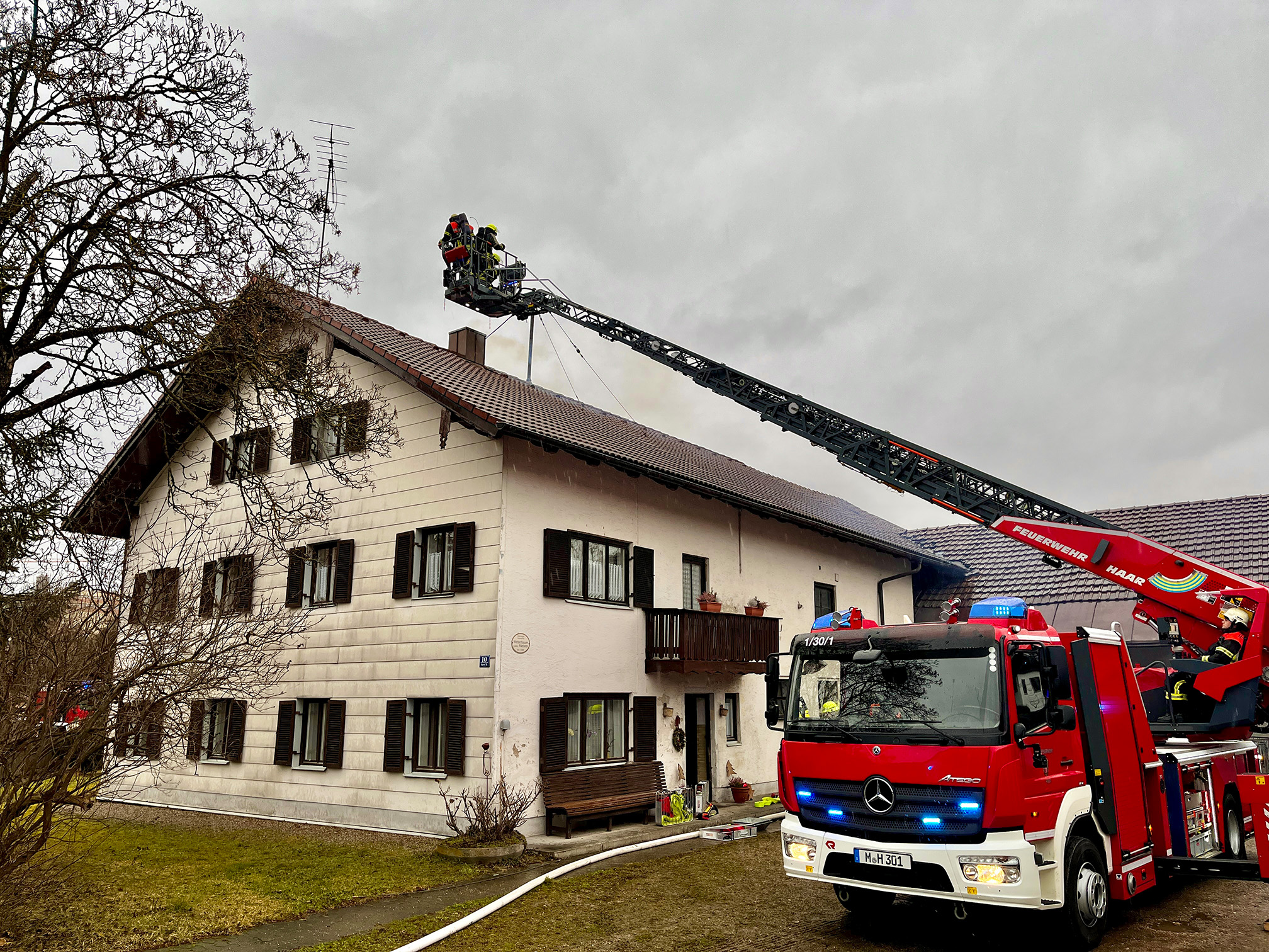 Die Drehleiter der Feuerwehr Haar wurde nach Putzbrunn zu einem Kaminbrand alarmiert.