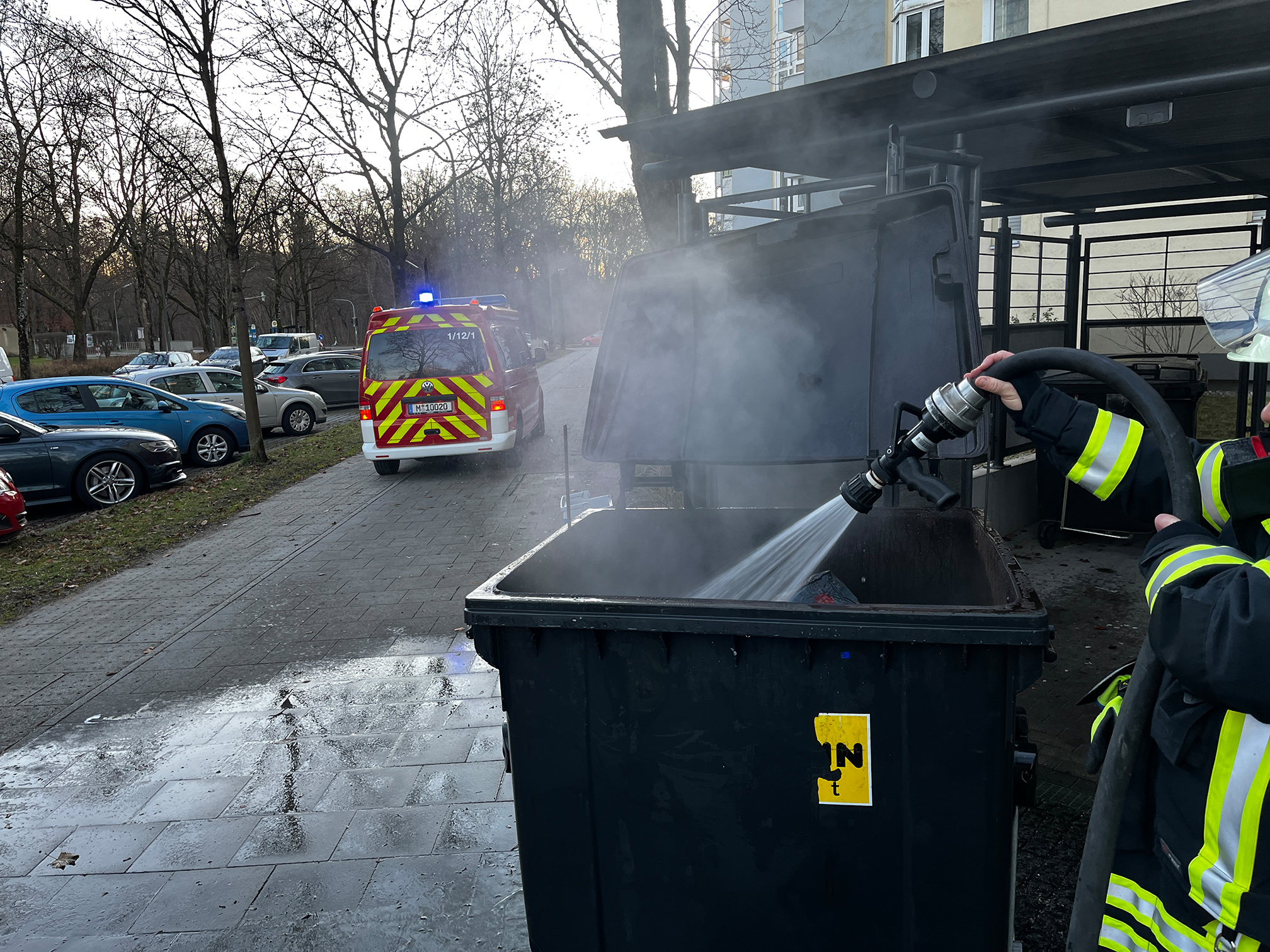 Die Feuerwehr Haar wurde zu einer rauchenden Mülltonne in den Jagdfeldring alarmiert.
