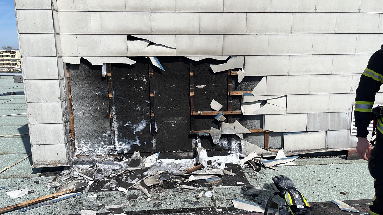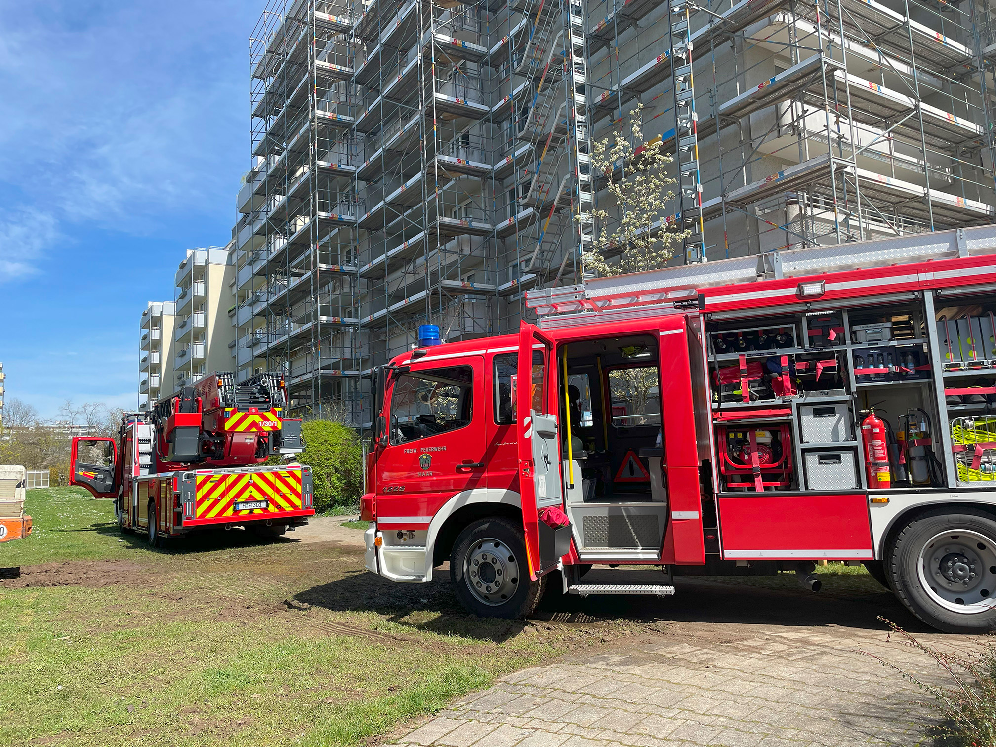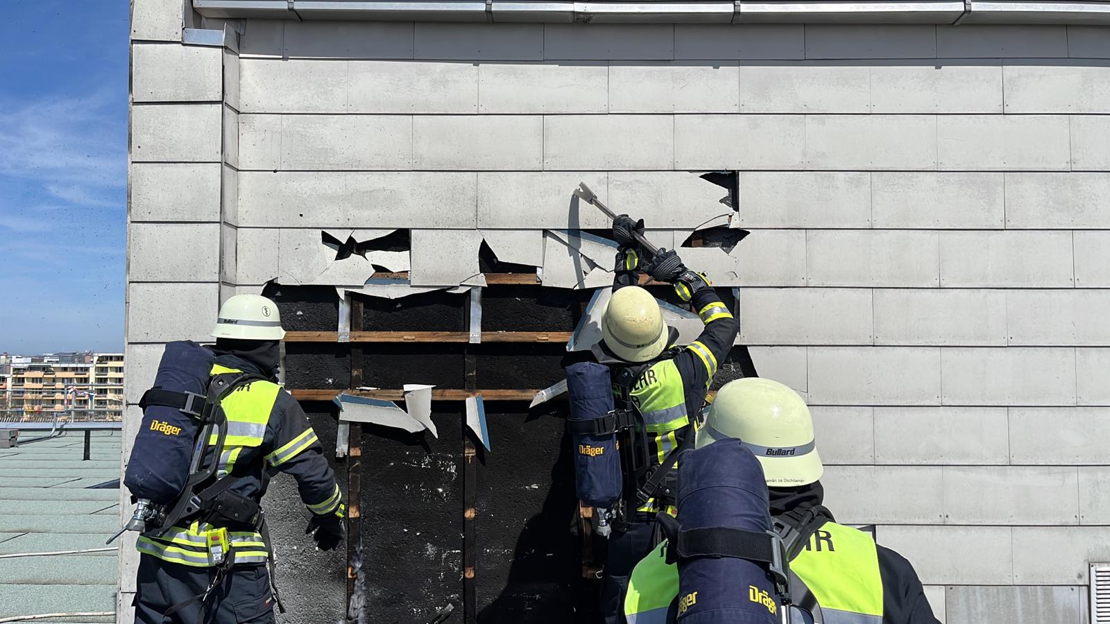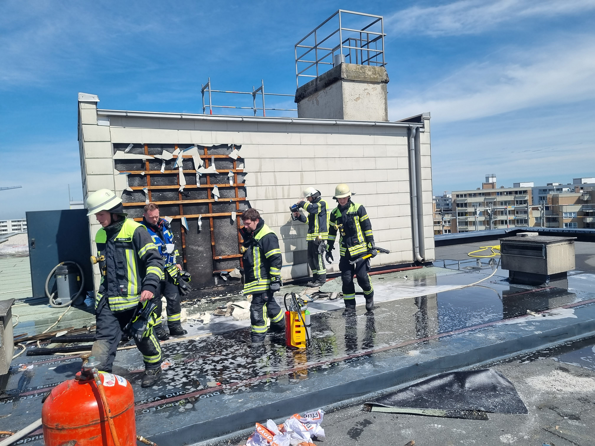 Nachbarn von gegenüber bemerkten eine Rauchentwicklung am Dach eines Wohnblocks und alamierten den Notruf. Die Erkundung vor Ort ergab, dass sich vermutlich durch die Arbeiten am Dach ein Brand hinter einer verkleideten Wand des Aufzugaufbaus und in der Isolierung zum Dach gebildet hatte. Zur Sicherheit wurden zwei unabhängige Wasserversorgungen über die Dehleiter und über die Steigleitung im Haus vorbereitet.