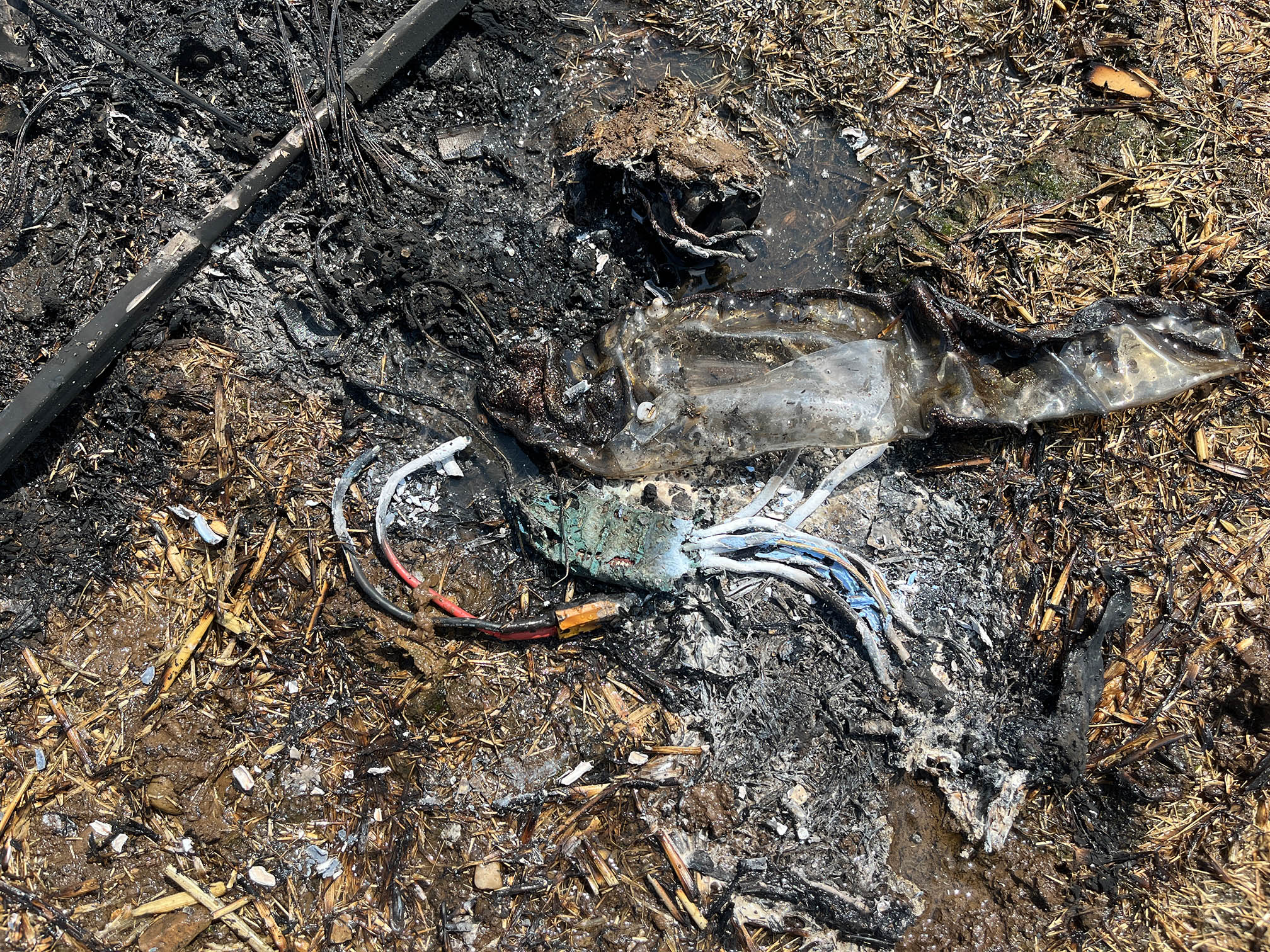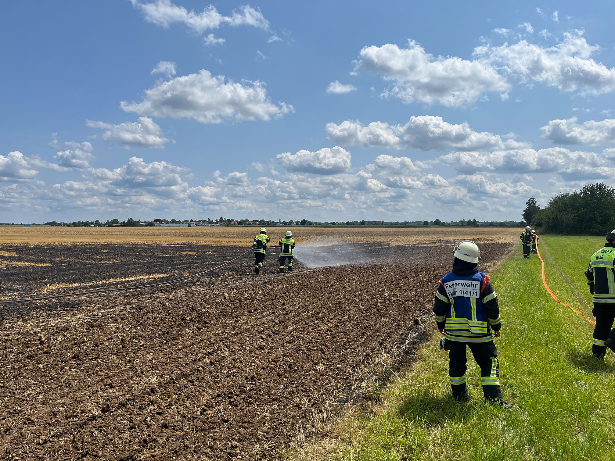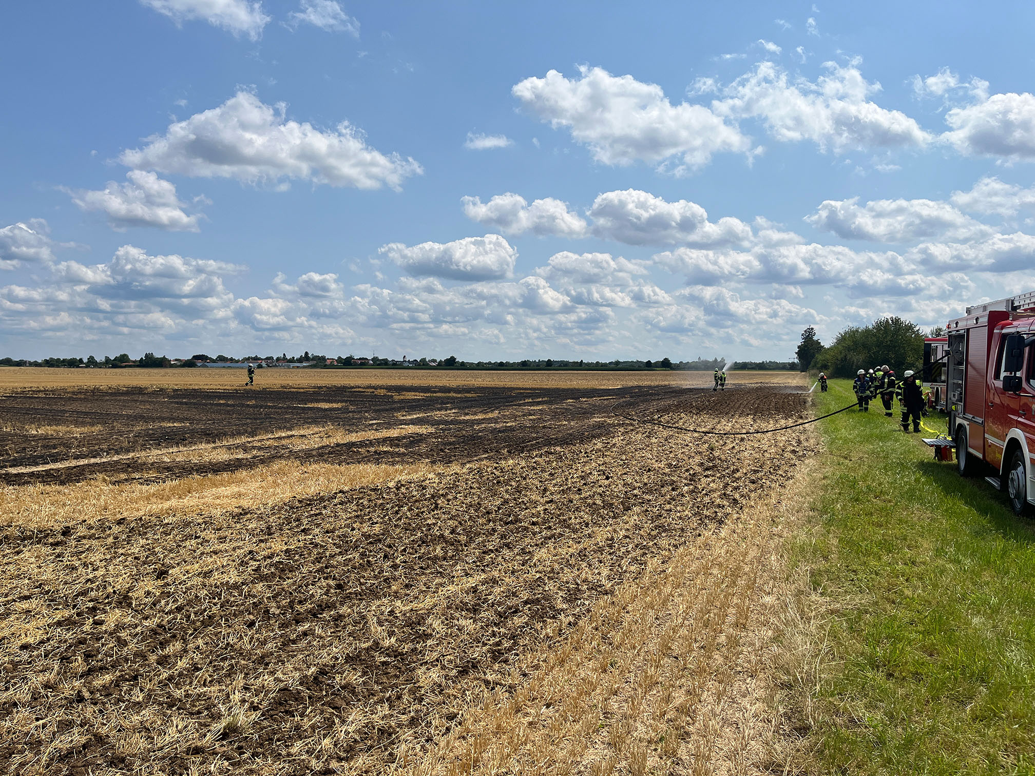 Beim Eintreffen der Einsatzkräfte der Feuerwehr waren lediglich an einer kleinen Stelle noch Flammen sichtbar, die mit dem Schnellangriff abgelöscht werden mussten. Die komplette Fläche wurde zur Sicherheit mit der Wärmebildkamera kontrolliert und musste gekühlt werden. Somit reichten zwei Schnellangriffsschläuche und entwa 2500l Wasser aus, um den Brand und etwaige Glutnester zu löschen.