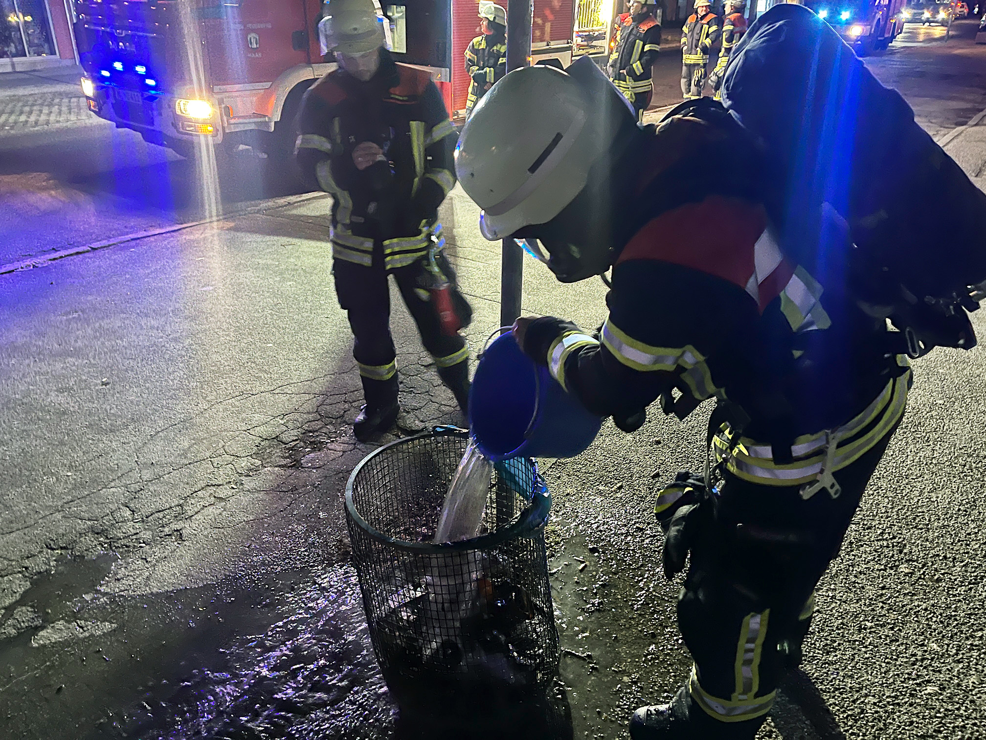 Mit einem Eimer Wasser war das Feuer im Mülleimer rasch abgelöscht, zur Sicherheit kontrollierten die Einsatzkräfte mit einer Wärmebildkamera den Mülleimer auf Glutreste.