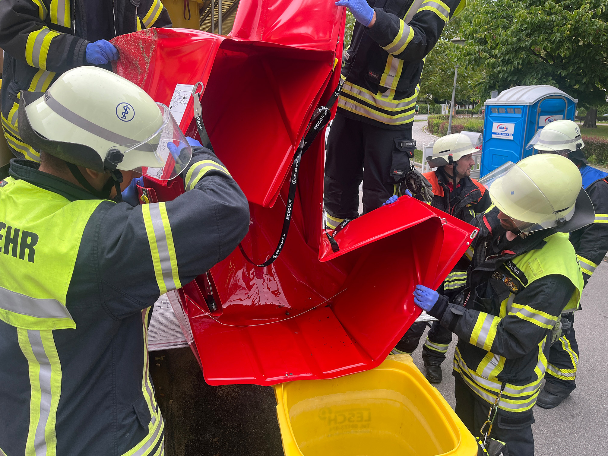 Nachdem das komplette, freie Öl von der Ladefläche in die Wanne geflossen war, konnte es in eine speziell dafür vorgesehene Mülltonne umgefüllt werden. Die Straße wurde noch gereinigt und die Feuerwehr konnte im Anschluss wieder abrücken.